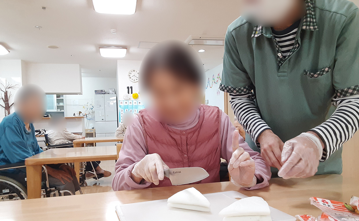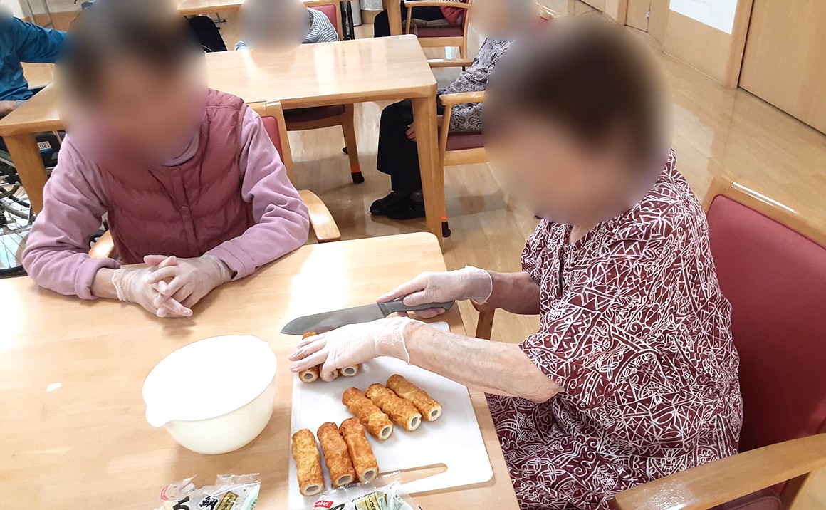 11/25日におでん作りをしました。 皆で役割分担し竹輪を切って頂く人、はんぺんを切る方、ゆで卵の殻剥きをして下さる人に分かれて職員付き添いの元行いました。 「これでいいの?」「大丈夫かしら」と笑顔絶えずとても良い雰囲気でした。 ゆで卵の殻剝きは苦戦されている方もいましたが一生懸命に最後までされていました。 いざ実食!!「美味しい~」と絶賛されていました。 寒くなってきてより一層おでんが染みました。