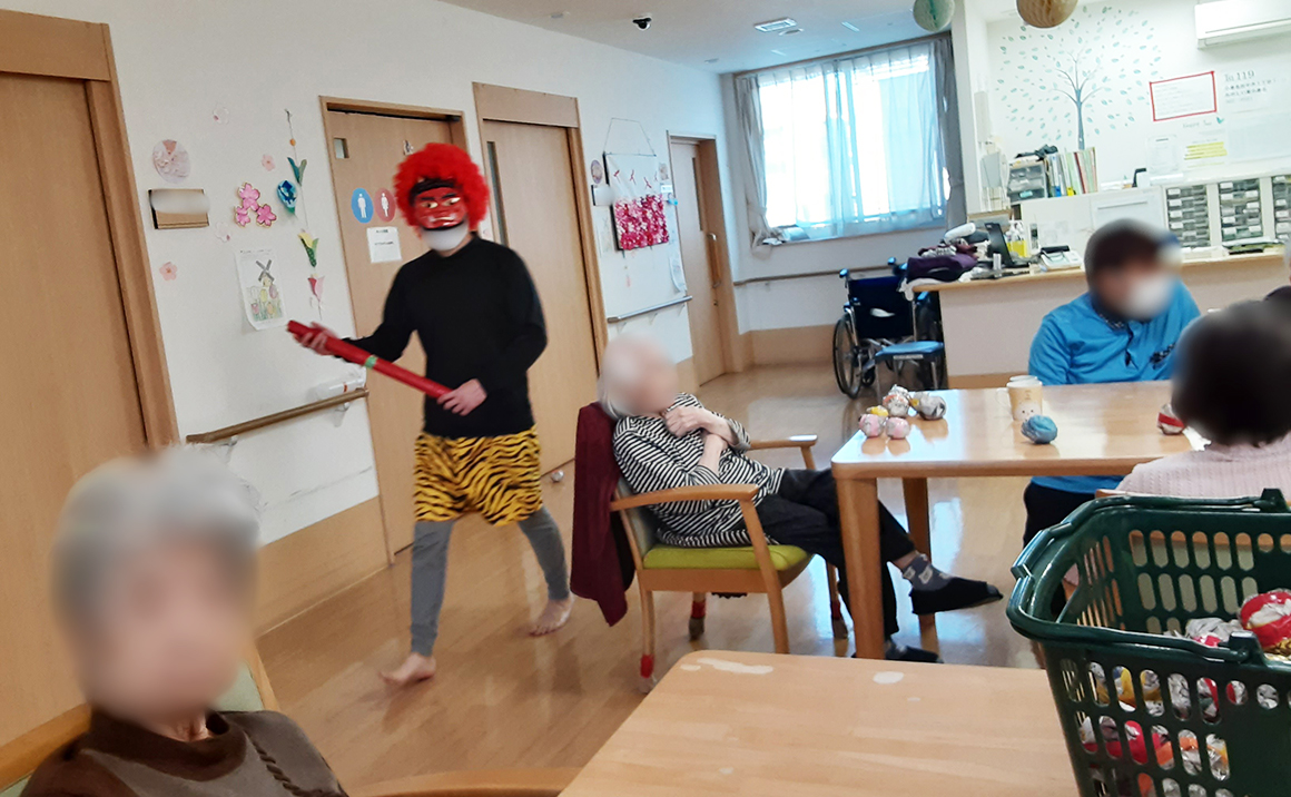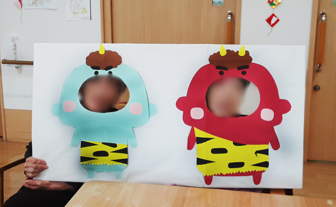 2月は節分のイベントを行いました。大きい鬼のパネルを作り皆様で記念撮影をしとてもいい笑顔でした。 職員も鬼になり豆まきを~鬼は外・福は内~!!!楽しんで頂けて私たちも嬉しいです。 ボール投げゲームもレクリエーションとして行い力強く上手く投げられていました。 無事に節分イベントを終え今年も福をたくさん呼びたいと思います。