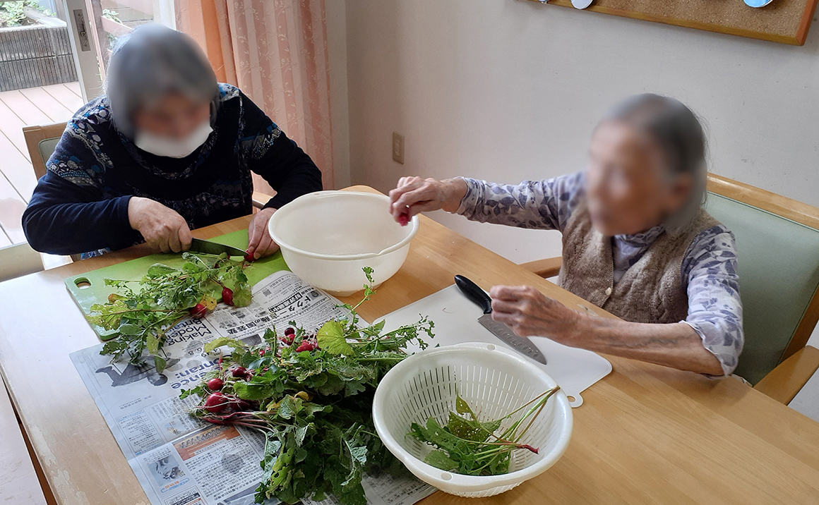 今回は収穫だけでなく、包丁を使い調理もしていただきました。今回調理に参加していただいた2名は90歳ちかくになるのですが