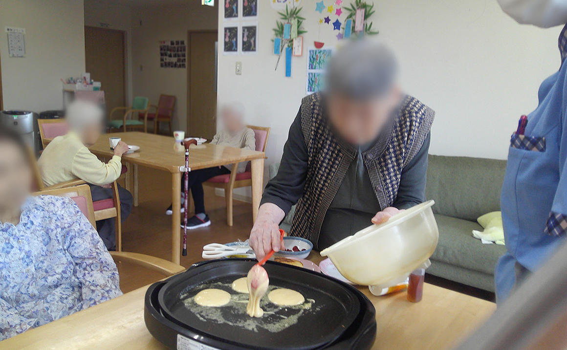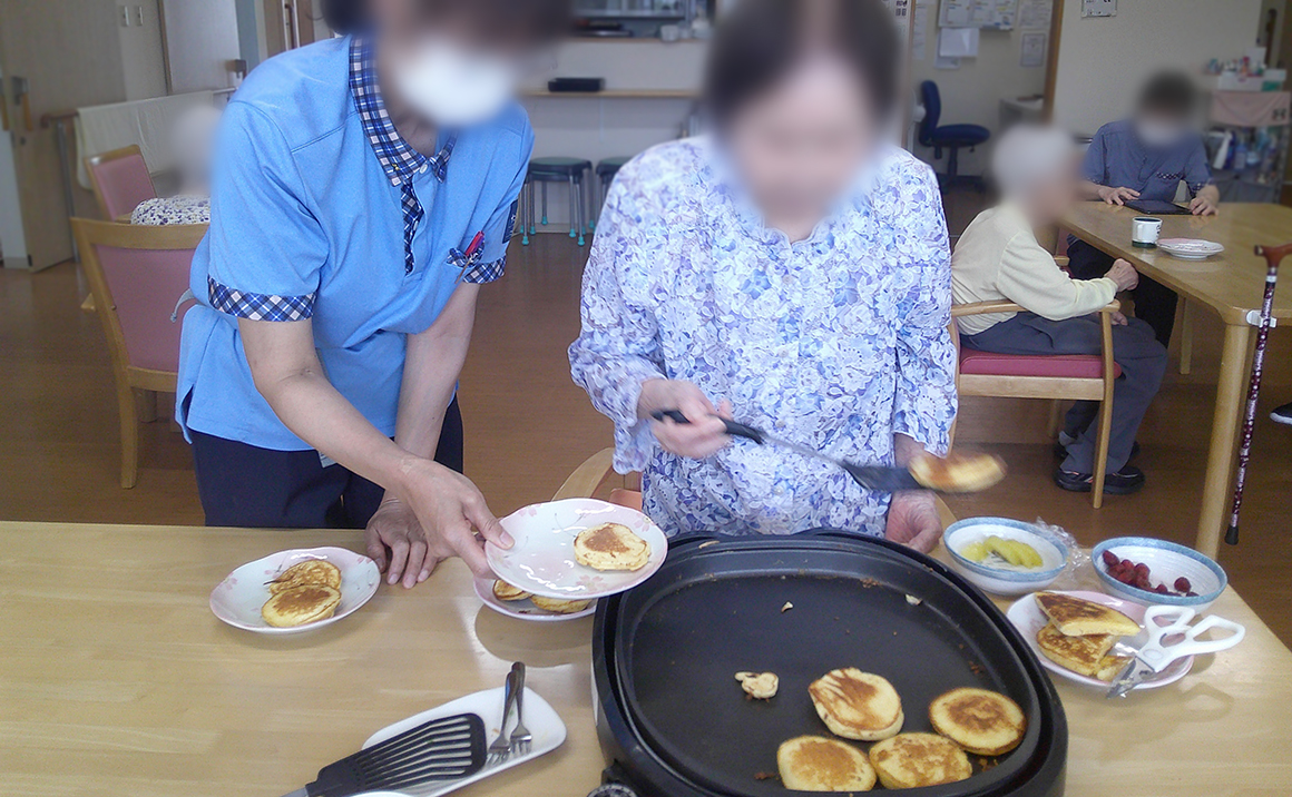 今回はおやつ作りの場面を紹介いたします。 といっても企画書をつくって大々的にやったことではなく、「牛乳の賞味期限が切れそうですね~」って所から始めたおやつ作りですが… 私なんかがホットケーキを作る時は、ドバーっと粉を入れてガーとかき混ぜダマになってしまうことが多々あるのですが、写真のように少しづつ入れしっかりかきまぜた方が美味しいホットケーキがつくれますね。 また何かおやつでも作りましょ~