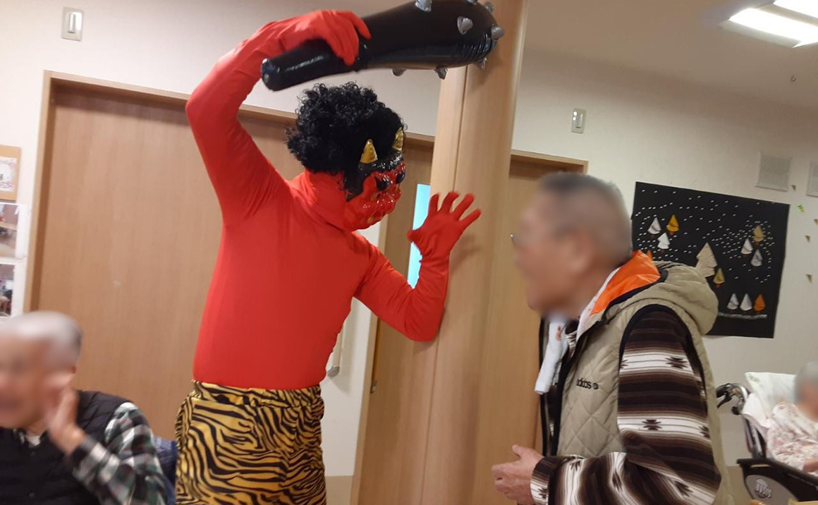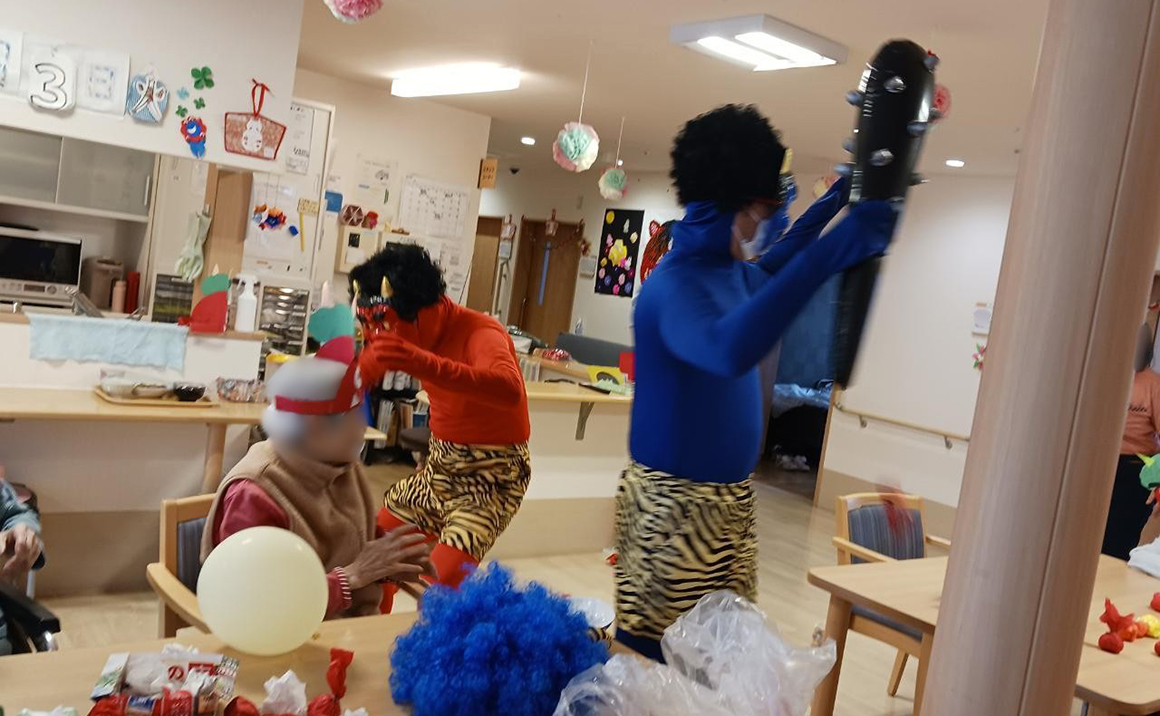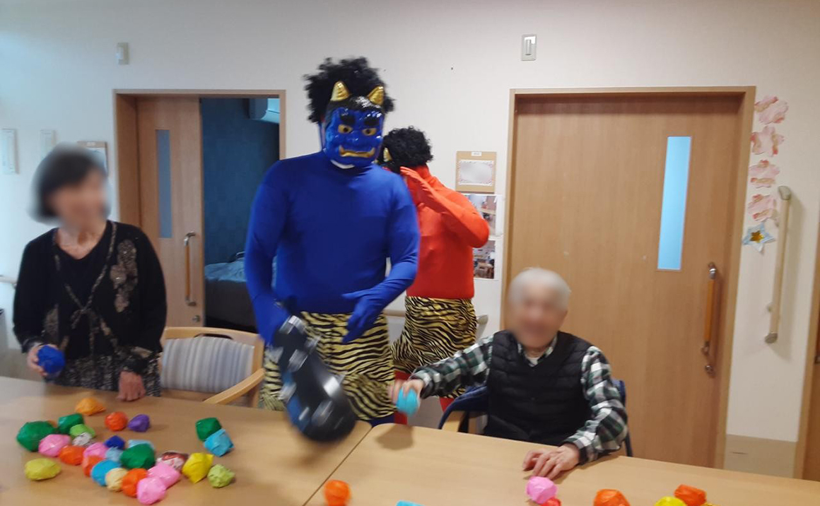 2月3日は節分ということで施設内でも節分祭を実施しました。 大きな鬼が3頭も現れみなさん真剣な眼差しで鬼退治をして頂きました。 なかなか倒れない鬼もいて鬼退治には時間がかかりましたが全員で施設に福を 呼び込むことができました!!