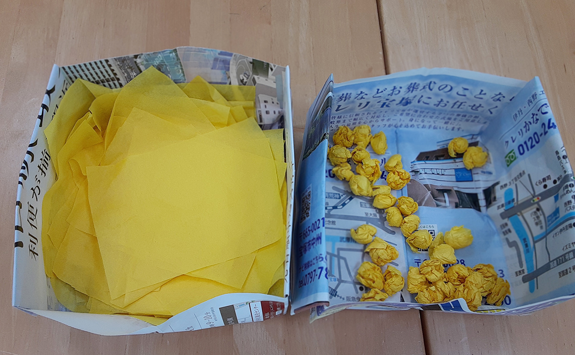 今回は壁絵作りの様子をお届けします。 ・利用者様に、同じ大きさに切った白色・黄色などの「お花紙」を丸めて頂きます。 ・丸めた「お花紙」を下絵の書かれた台紙にノリで貼り付けて行きます。 今はまだ「お花紙」を丸める段階ですが、皆様一生懸命に丸めて下さっています。 3番目の写真が見本の絵です!!見本通りに出来るのか……。 来月のブログで、お知らせいたします。お楽しみに!