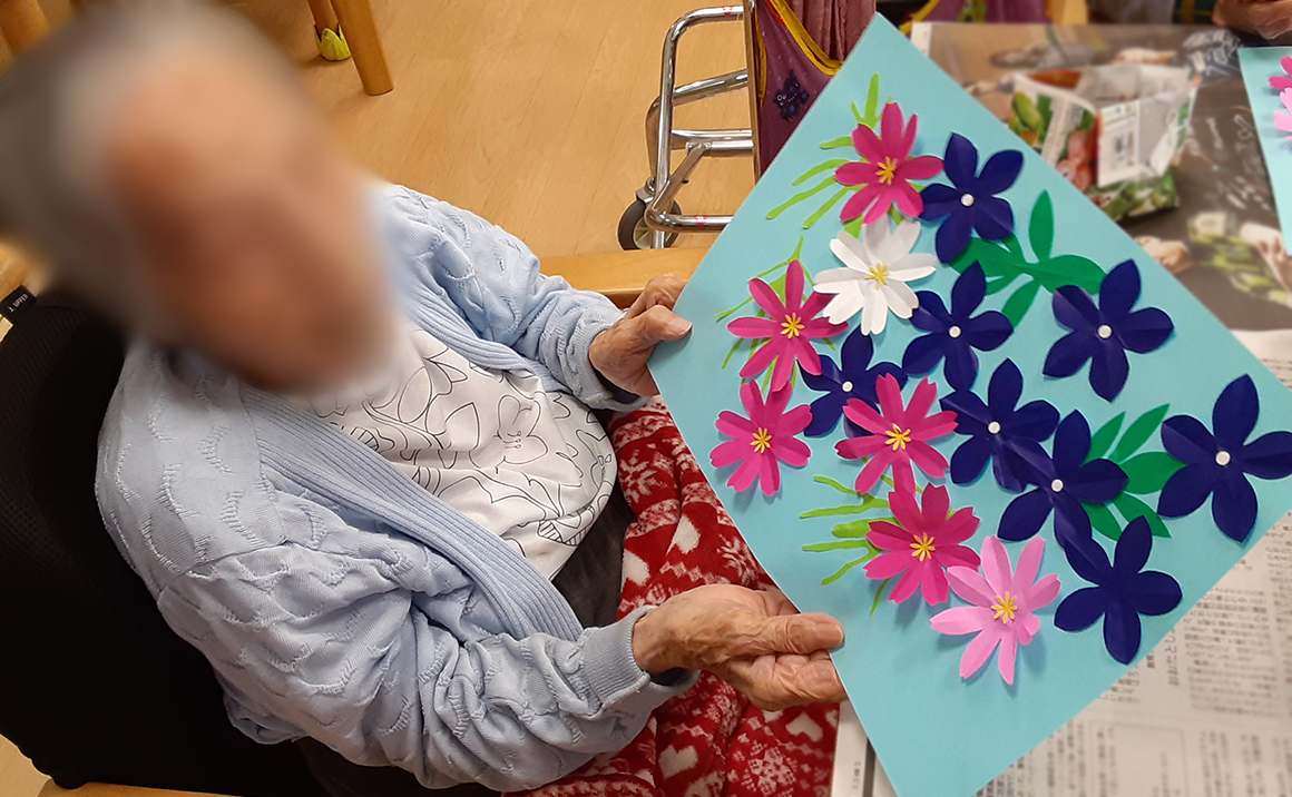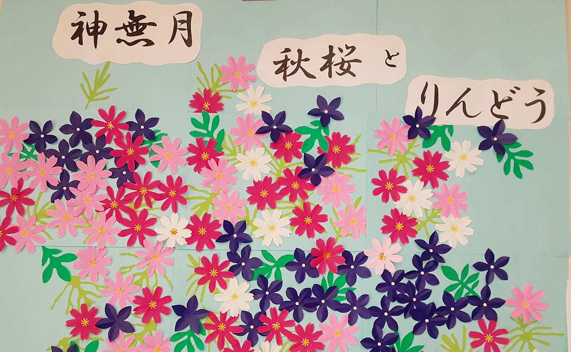 10月の壁絵は秋らしく「秋桜とりんどう」です!! 利用者様に個別で1枚の画用紙に貼って頂きました。 貼っていく花なども、器用な利用者様が切って下さいました。 個人差があるので、苦手な方はスタッフがお手伝いさせて頂いております。 「ここは、私が貼った所よ!!」と覚えておられ、笑顔を見せて下さる利用者様もおられます。 皆様の力作をご覧ください。