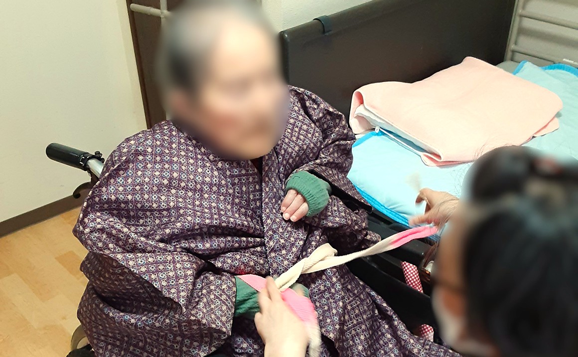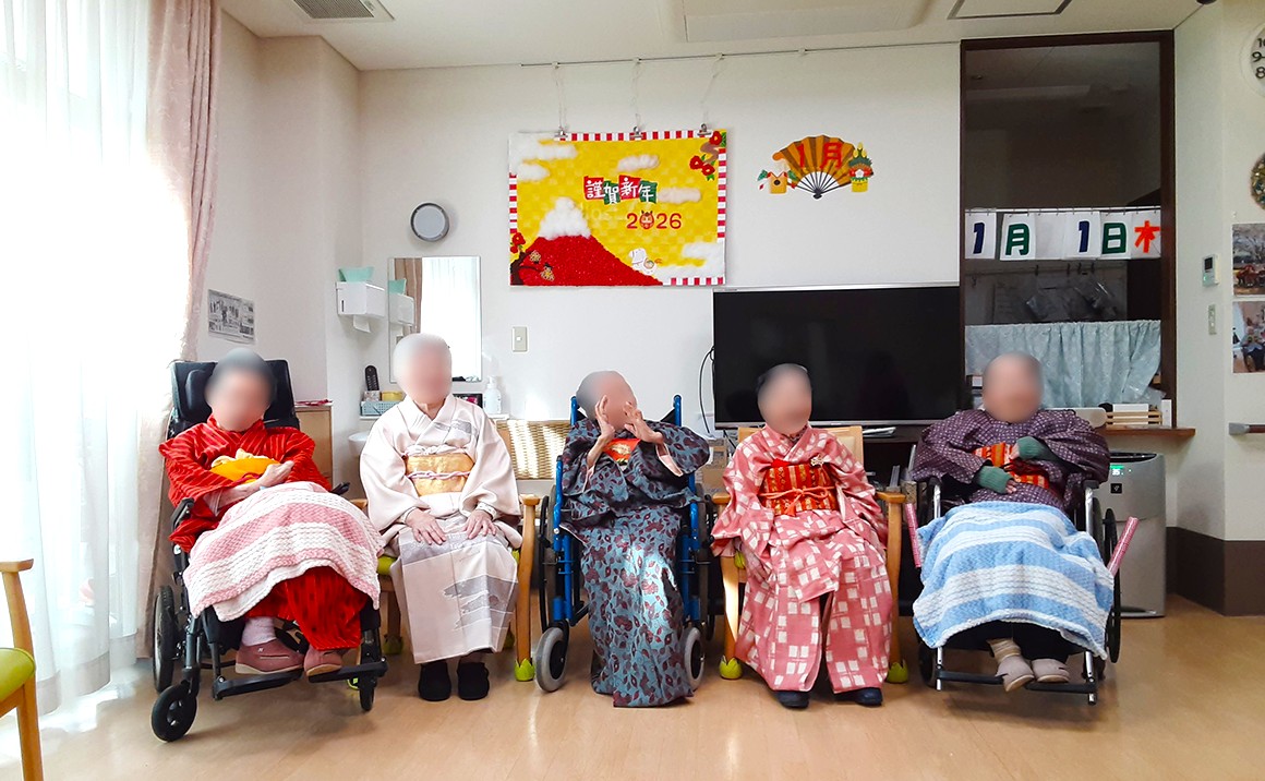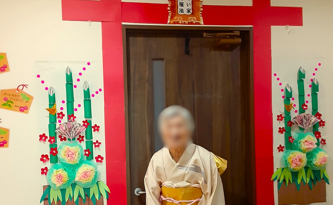 1月1日 御利用者様に着付けをさせて頂いて写真撮影をしました。 着物をお召しになると、晴れやかなお顔になられます。 車椅子の利用者様も工夫して着付けをさせて頂きました。 お一人お一人「たのしい家伊丹堀池神社」の前で写真を撮らせて頂いています。(笑)