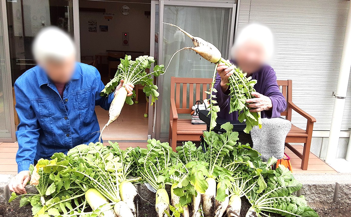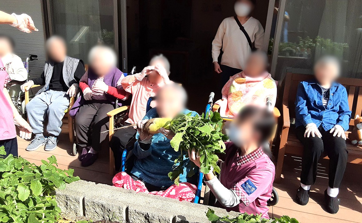 暖かい日に、1階2階の利用者様で菜園の大根の収穫をしました。