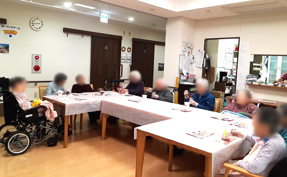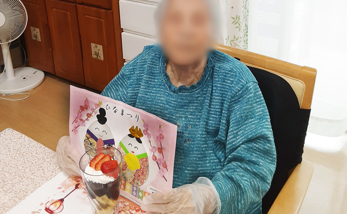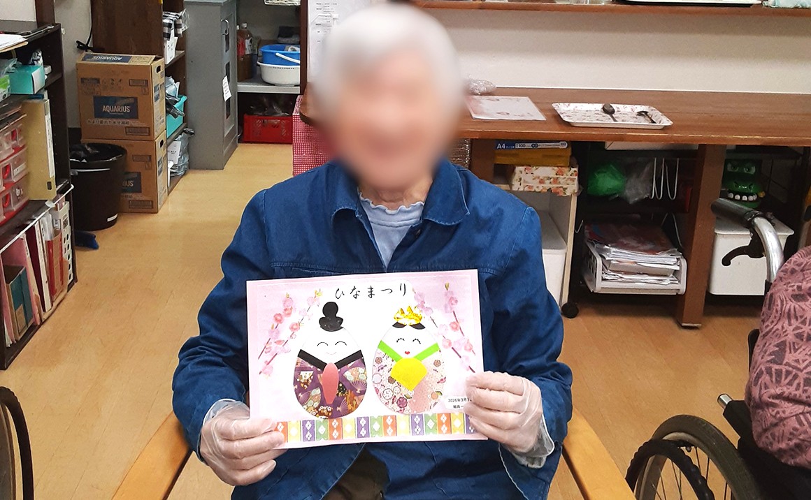 3月3日 桃の節句 ひな祭りを行いました。 昼食で、ちらし寿司を召し上がって頂いた後に 3時のおやつのカップケーキを作って頂きました。 1人1人違ったカップケーキが出来上がりました。 ご自身で作られたカップケーキは、特別だったのでは ないでしょうか⁈ カップケーキ作りの後は、お雛様のカードを持って 『ハイ!ポーズ。パチリ‼』