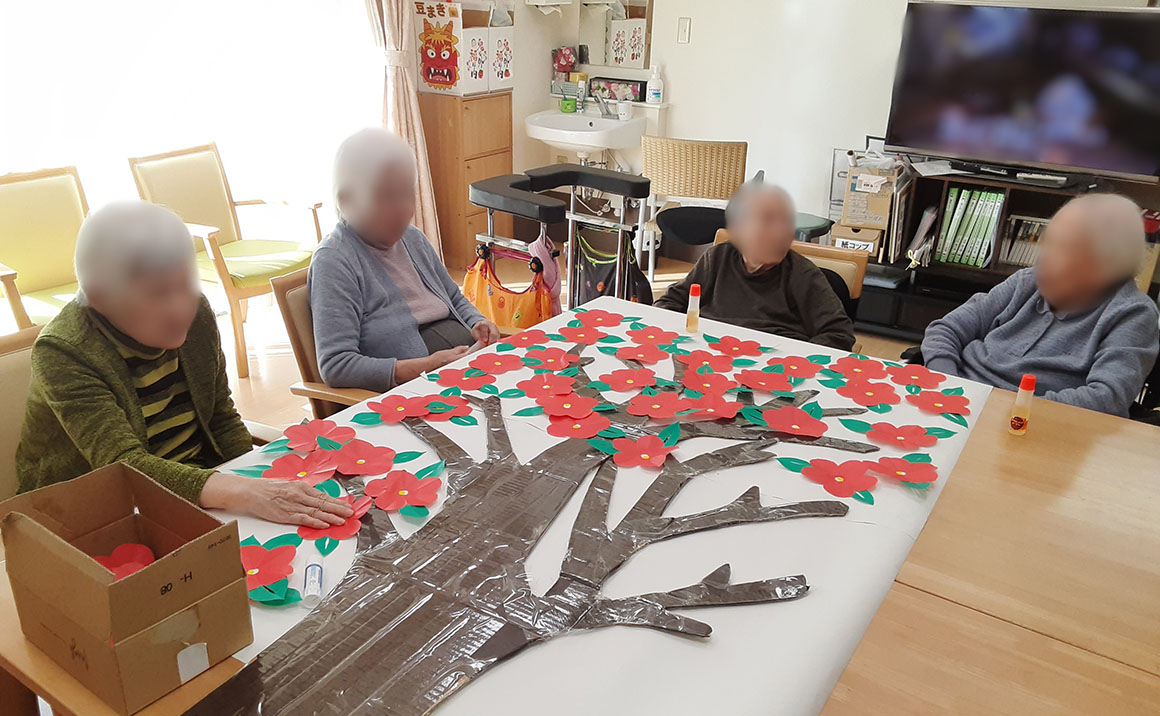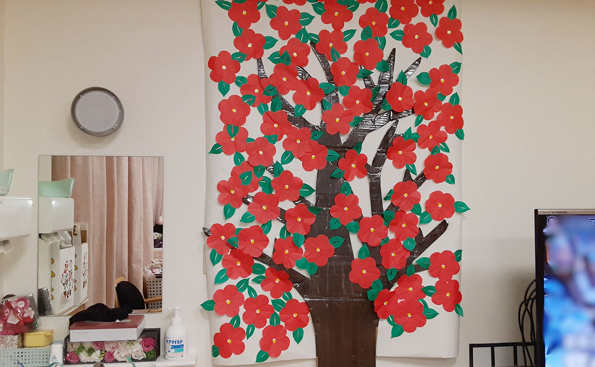 3月の壁絵は…「椿」です。 折り紙を切ったり、台紙に張ったり皆さん頑張って下さいました。 椿に見えますか??(笑) 4月の壁絵は何ができるか楽しみです‼