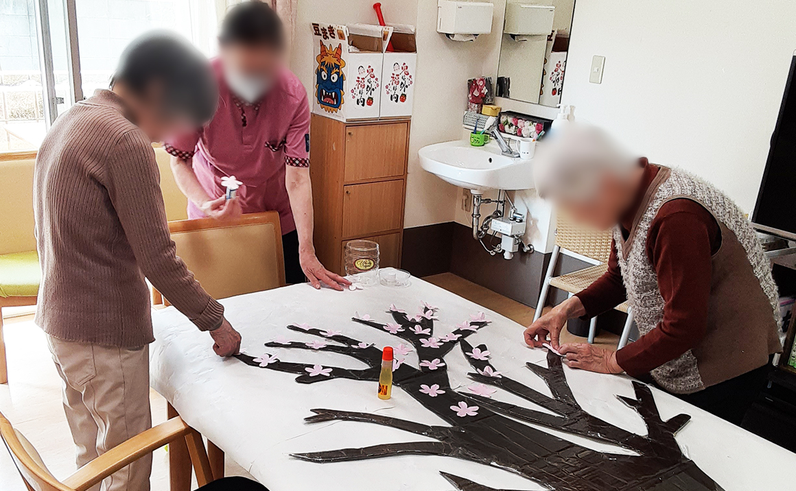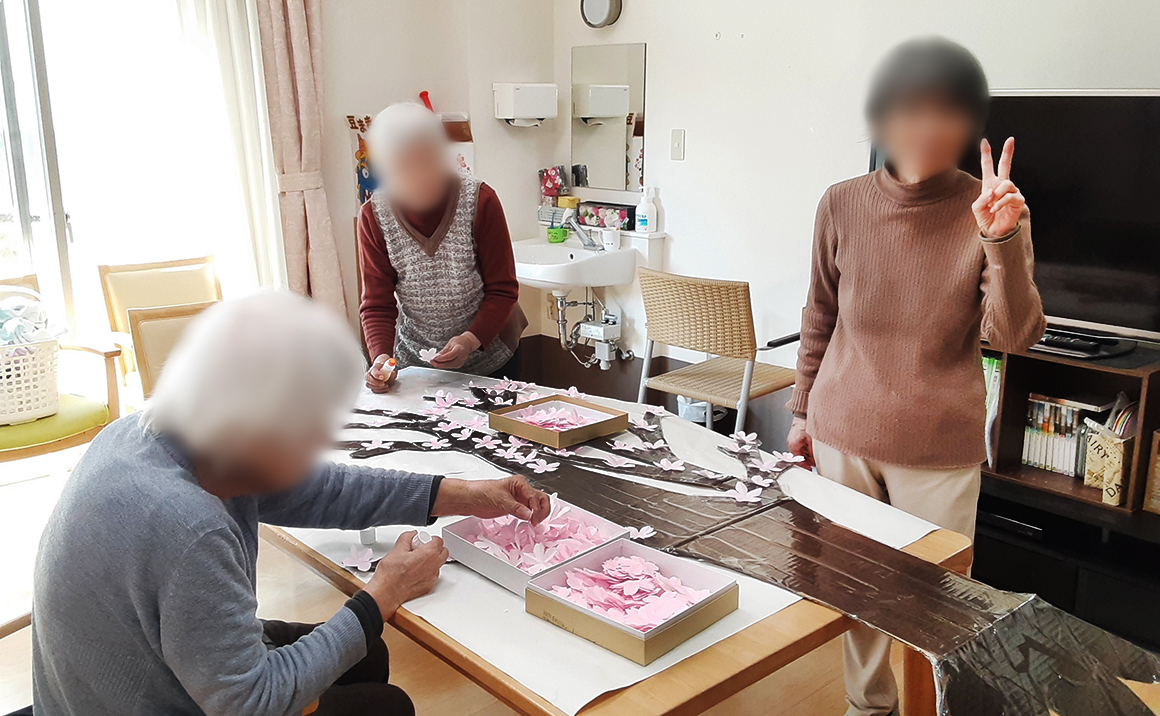 今月の壁絵は『桜』です!! 花びらを作成するところから、木に張り付けるところまで 真剣に取り組んでくださいました。 次は本物の桜を見に行くお花見が楽しみです。(笑)