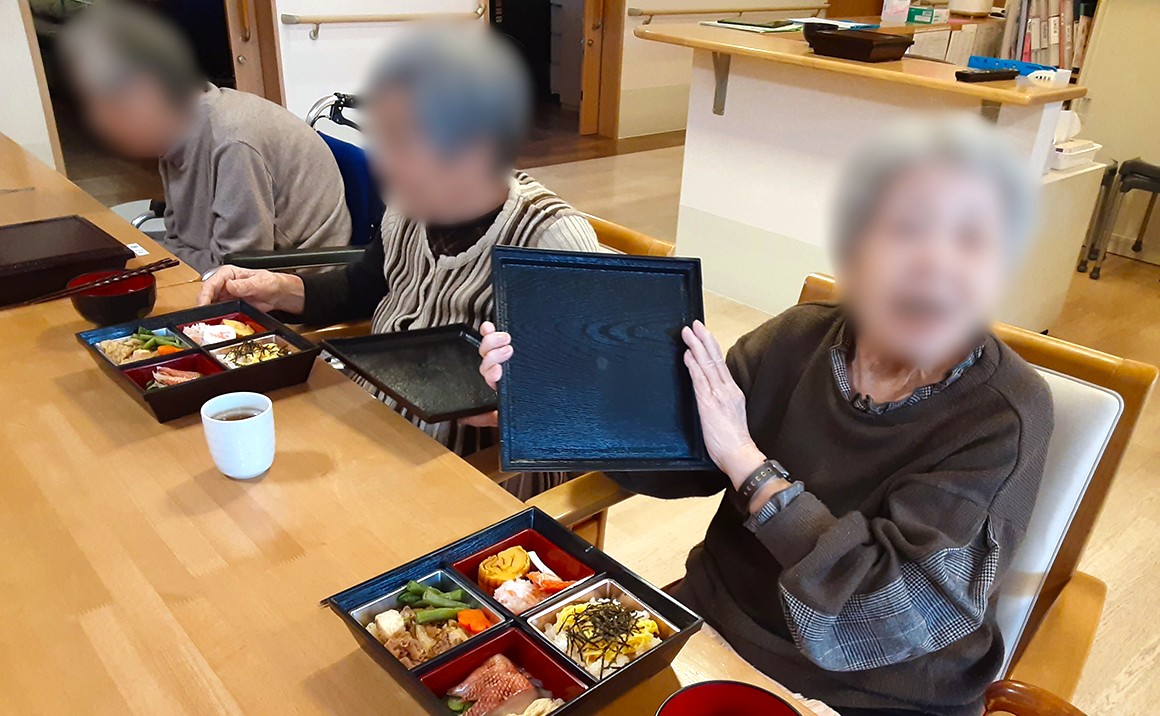 1月1日には利用者様に正月の雰囲気を味わって頂きたく、特別食を発注し御節料理を召し上がって頂きました。 家庭で一から御節料理を手作りされていた方が多く、昔を懐かしむように思い出話を語らいながらお召し上がりになりました。