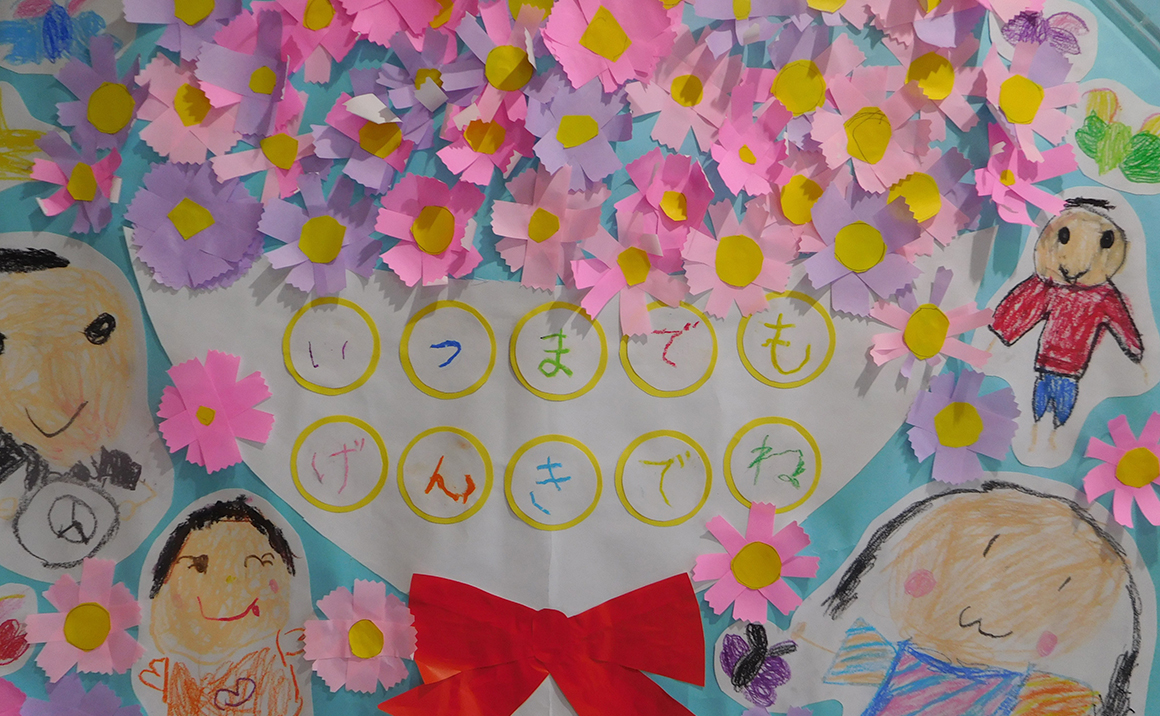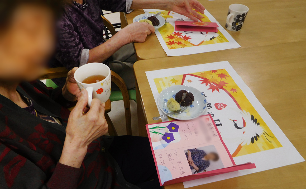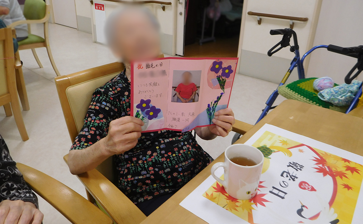 たのしい家大原では9月17日に少し遅い敬老会をさせて頂きました。 午前中は近隣の保育園児さんが遊びに来て下さいました。 歌をうたいながら肩たたきをして下さったり、一緒にボール運びをして遊びました。 皆さん終始「かわいいね、かわいいね。」と普段は見られない超笑顔でした。 午後からは手作りのおはぎとメッセージカードでささやかですがお祝いをさせて頂きました。