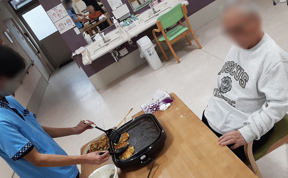 今月のお楽しみ食事会は、皆さんと一緒にお好み焼きを焼きました☆ 始めは遠慮されていたご利用者様も、焼き始めるととてもお上手に焼いておられました☆ 美味しく、皆さん一緒に楽しい時間を過ごして頂く事が出来ました☆