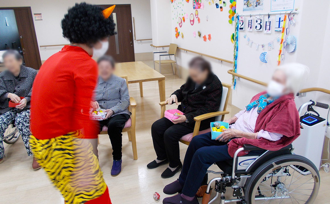 今月初めに節分と言うことで豆まきをフロアごとで行いました。 豆まきを楽しんでいる姿がとても良かったです。 インスタグラムも投稿しているのでそちらもフォロー&いいねを押していただけたらと思います。 今月も体調管理を徹底し職員一同、sun・sun・sun・smileで頑張りたいと思います。 是非お気軽にたのしい家桂に見学にお越しください。 いつでもお待ちしております。