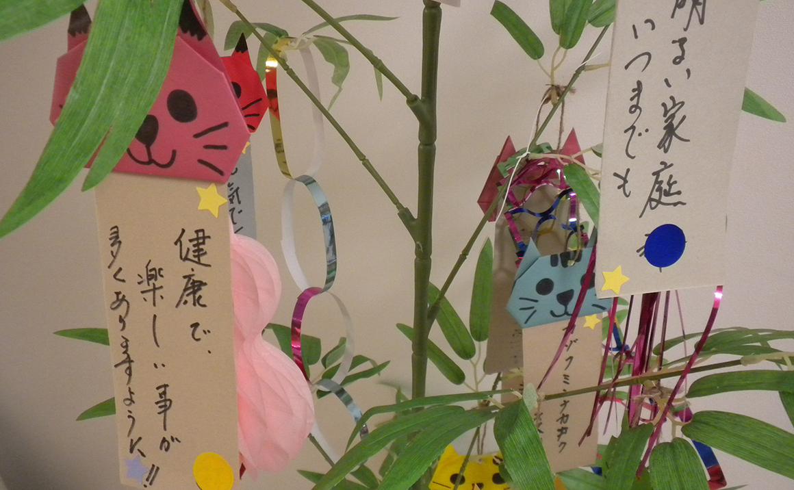 7/7の七夕に向け、入居者の皆様にはそれぞれ短冊に願い事を記入していただきました。 ご自身の健康や、ご家族の健康、世の中が平和であることなど様々な思いが込められていました。 皆様の願いが叶いますように・・・