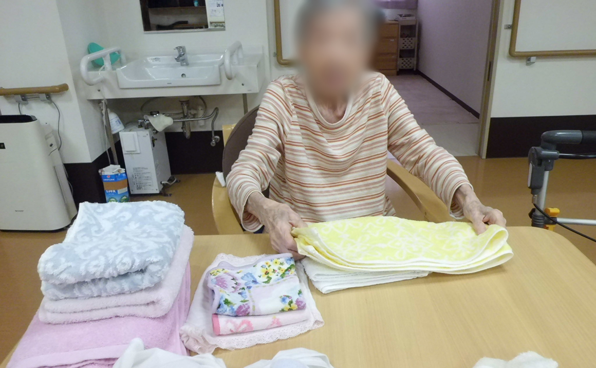 職員が洗濯物をお持ちすると、目をキラキラさせ丁寧にたたんで下さいます。