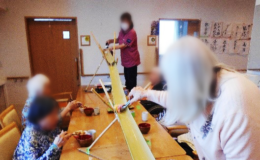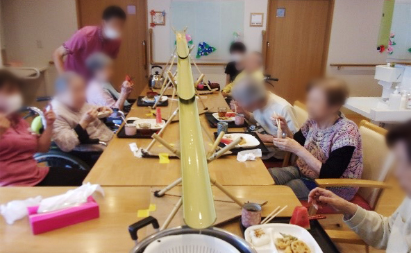 たのしい家帝塚山に「熱い・暑い・熱い」夏が到来しました! ドミノ倒しが成功し今年の夏のイベントをご利用者様・スタッフ全員で楽しんでいきます! 夏のイベント第一弾!~流しそうめん~ 本格的な竹を使用し「夏やねぇ」とワクワクしながら流れてくるそうめんを上手く取り、美味しく召し上がりました。 冷たいスイカも美味しく召し上がり、夏の風物詩の始まりです。