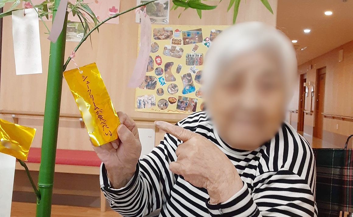 今年ももう7月、七夕の季節ですね! 入居者の皆様にも願い事を笹に書いて頂きました。 笹を見させていただくと健康に過ごしたい、という穏やかなものから お寿司やケーキを食べたいとの食欲に満ちたものまで様々です。 中には私たちで叶えることが難しいお願いもありましたが、可能な限り 実現してゆけるよう頑張ります!!!