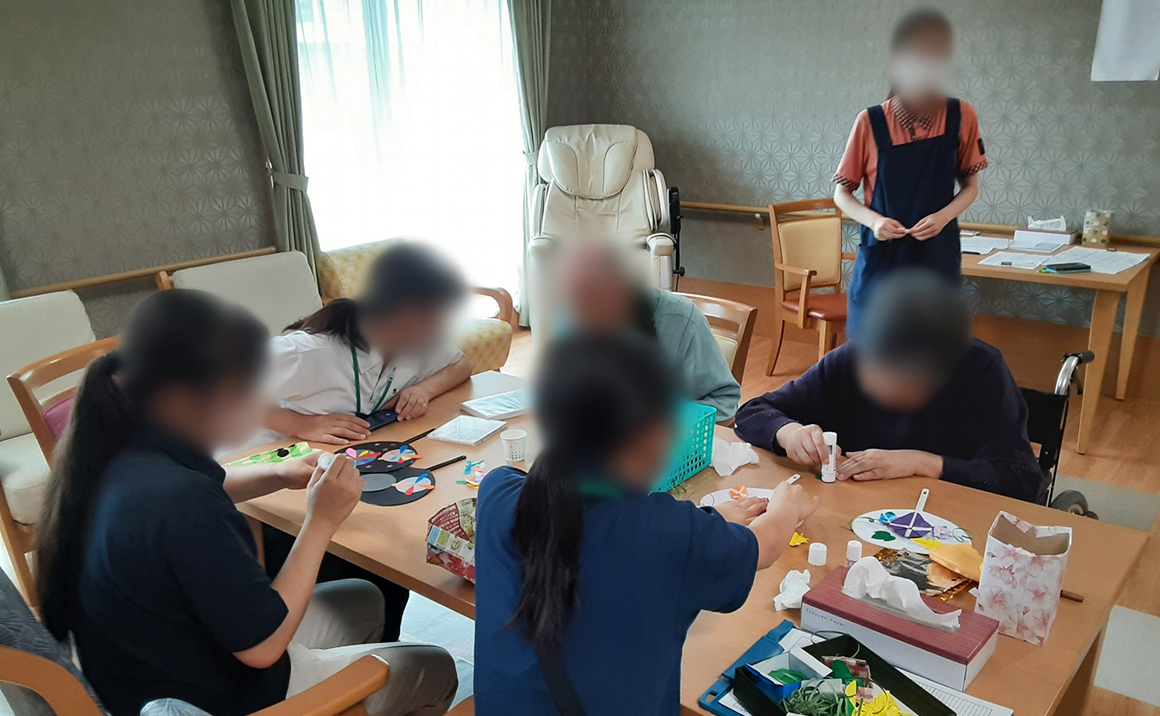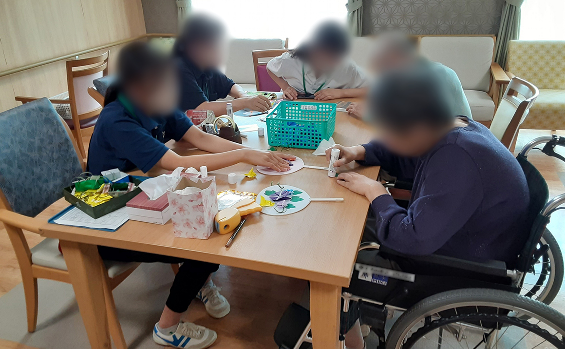 今回は、教員免許取得のため実習に来た学生さんと共に8月イベント、「納涼祭」に向けたうちわ作りに取り組んで頂きました。 皆様ベテランの手さばきで様々飾りを作られていますね。 若い学生たちにも色々とアドバイスをされ楽しまれたご様子です。