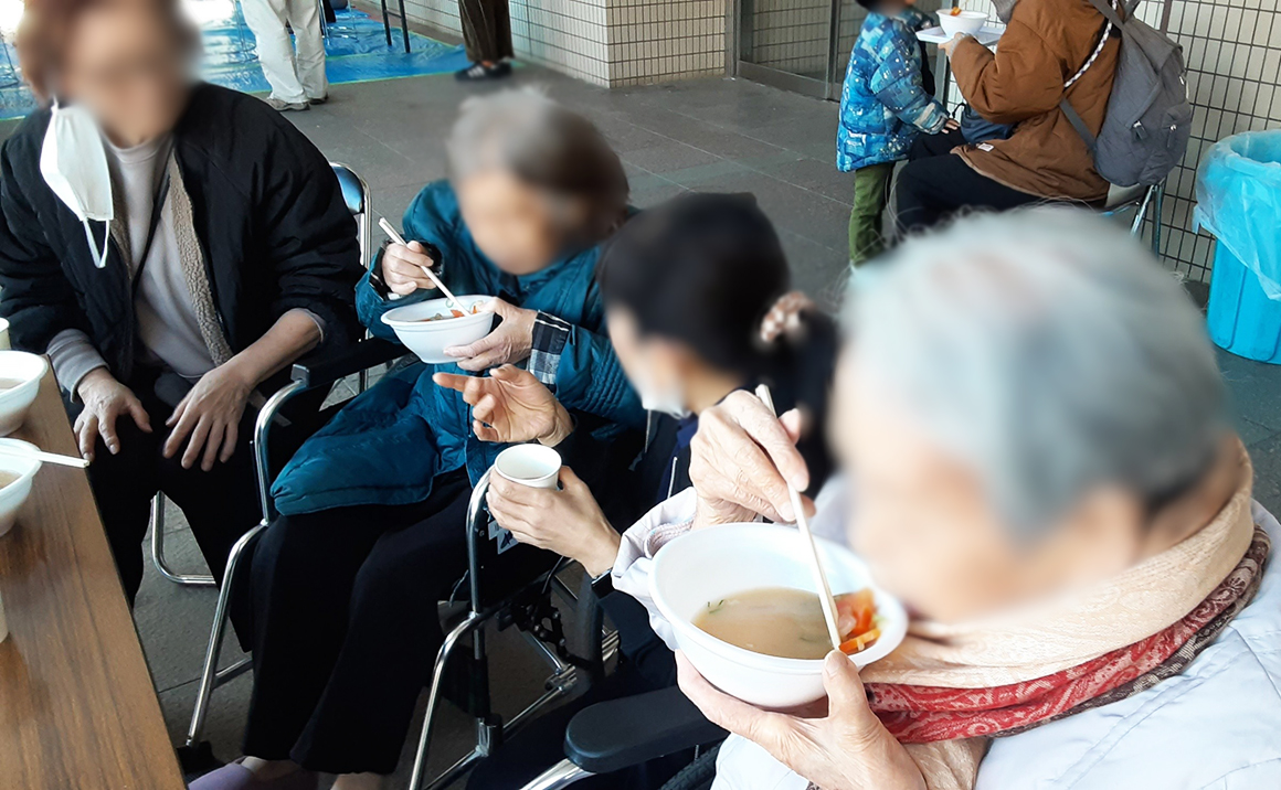 やはりお餅はその場のつきたてが一番ですね。参加されている 地元の子供たちなども笑顔で食べる姿が目立ちます。 ご利用者の皆様は残念ながら喉つまりの心配からお餅は頂けません でしたが、一緒に配られた豚汁は周りの賑やかな雰囲気もあり とても美味しく頂きました☆