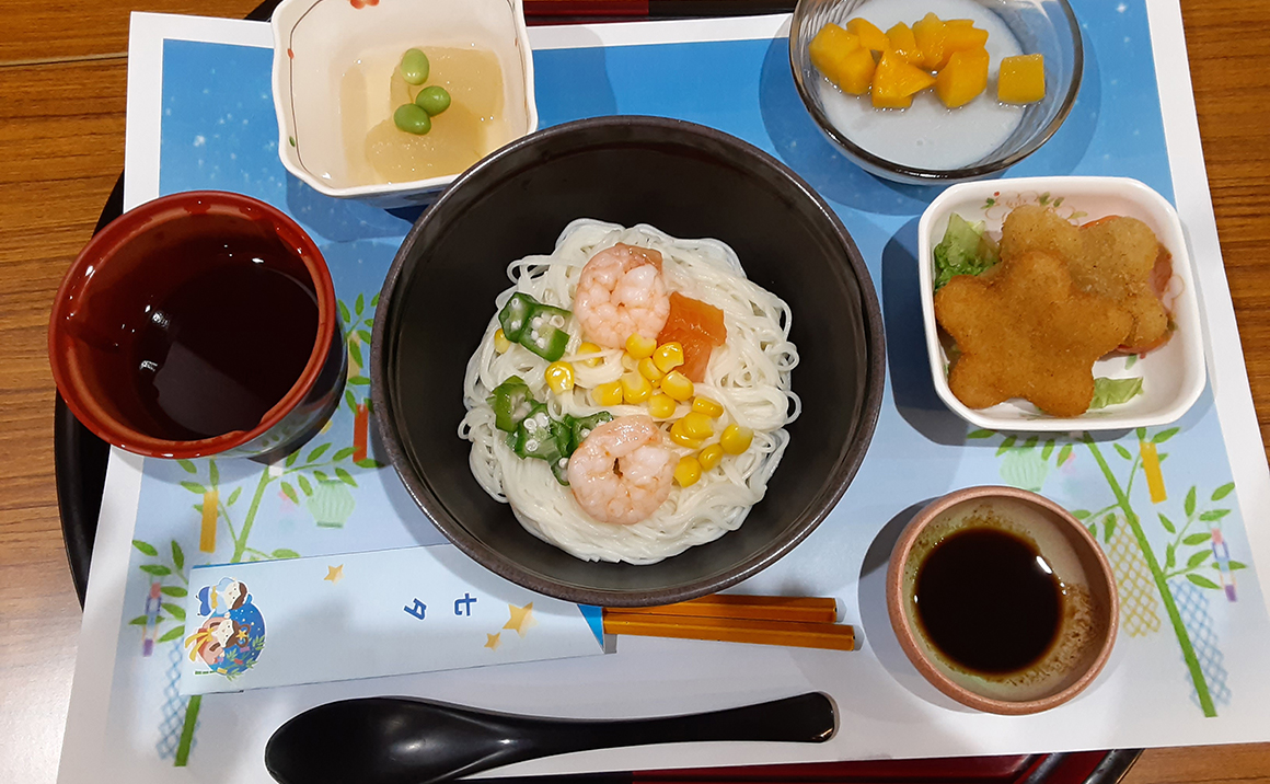 ★【本日の七夕メニュー】★ ・七夕そうめん(むきえび、オクラ、コーン、トマト) ・星コロッケ ・冬瓜と枝豆の煮物 ・七夕ゼリー