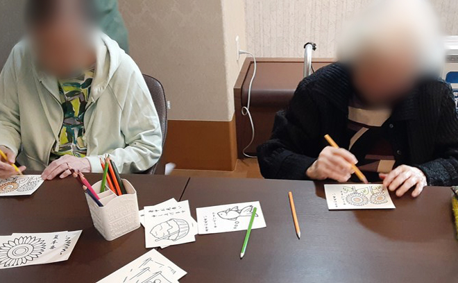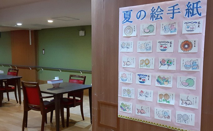季節の絵手紙作りを行いました。 ひまわり、すいか、かき氷、金魚等、ご用意した中からお好きな絵柄を選んでいただき、思い思いに色をつけて仕上げていただきました。 皆様それぞれの個性が光る、素敵な作品が完成しました。 完成した作品は、現在食堂に展示しております。