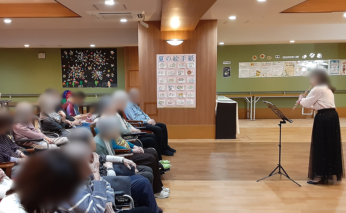 今回は、Camelliaのおふたりをお招きして、ピアノ&フルートによるコンサート開催致しました。 クラシックから、歌謡曲、唱歌と次々と演奏していただきました。 演奏が始まると、優しいフルートとピアノの音色に耳を傾けていらっしゃいました。
