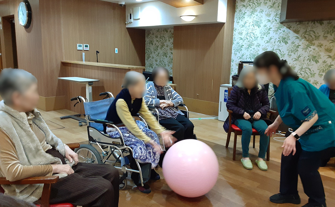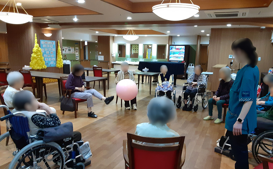 運動プログラムの一環として、セラピーボールを使ったボール蹴りを行っています。 大きなセラピーボールを相手に向かって蹴ったり、受け止めたりすることで、足だけでなく体幹も鍛えることができます。 皆様が思わず夢中になる、人気のプログラムの1つです。