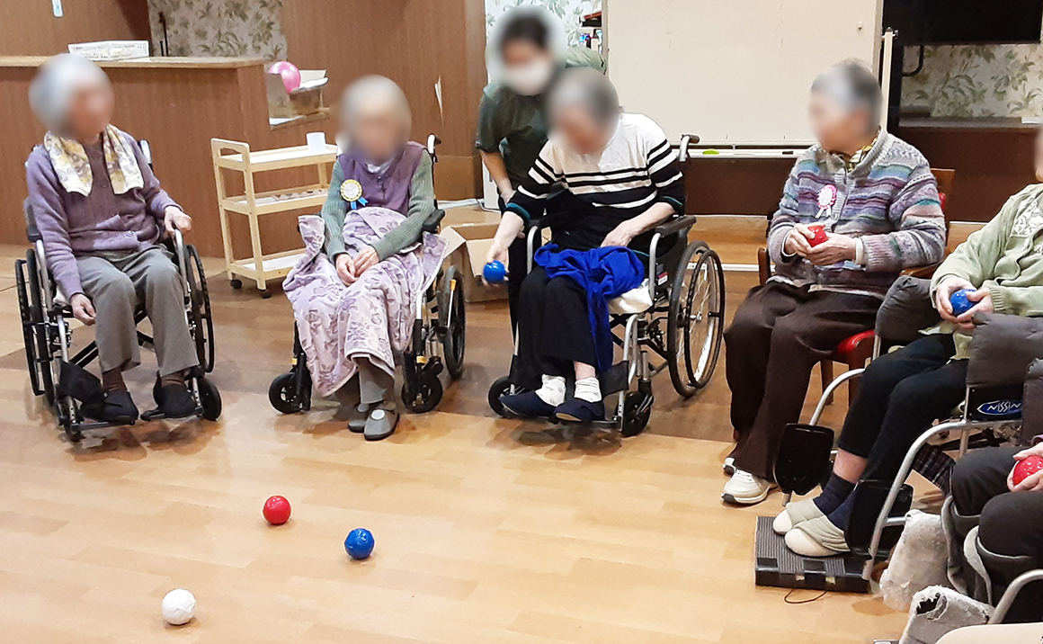 プレザングラン新宿下落合では楽しみながら身体を動かすレクリエーションを大切にしています。 この日はボッチャを行いました。 ボッチャは白いボールに向かって赤と青のボールを投げ、どれだけ白いボールに近づけられるかを競うスポーツです。 皆様、真剣な表情で狙いを定めながら、笑顔で楽しまれていました。