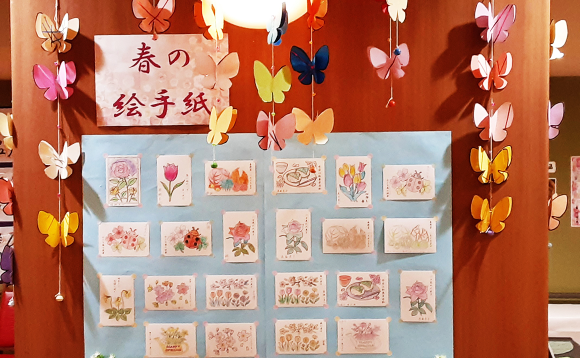 本日はレクリエーションの時間に蝶の飾りを作りました。 色紙を蝶の形に切り抜き、ビースと一緒に紐でつなげて飾りを作ります。 皆様、はさみを上手に使って丁寧に蝶を切り抜いてくださいました。 完成した蝶の飾りは絵手紙の周りに飾り付け、春らしい華やかな壁飾りが完成しました!