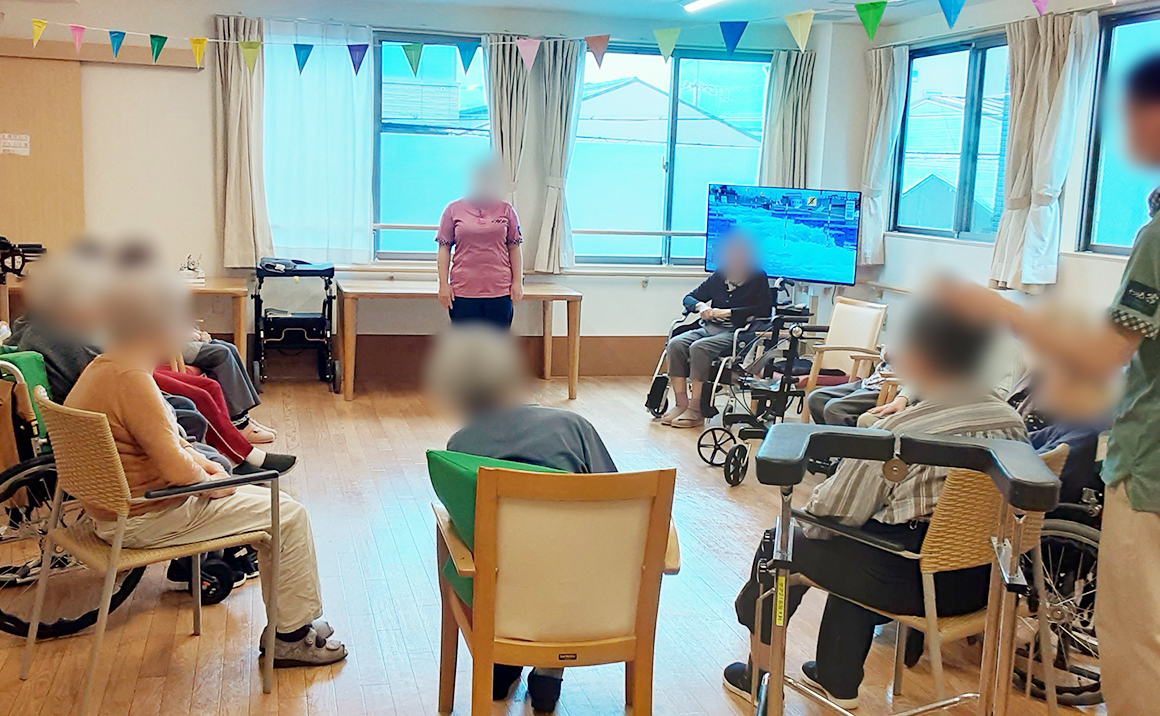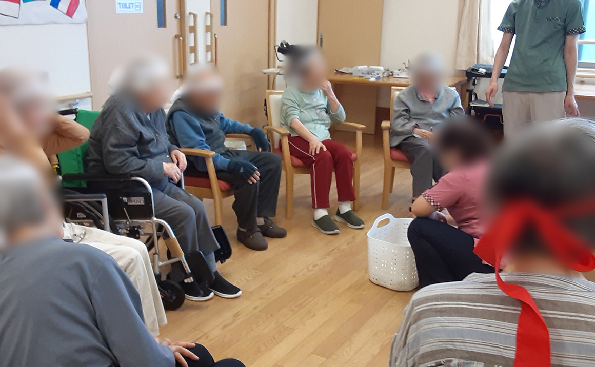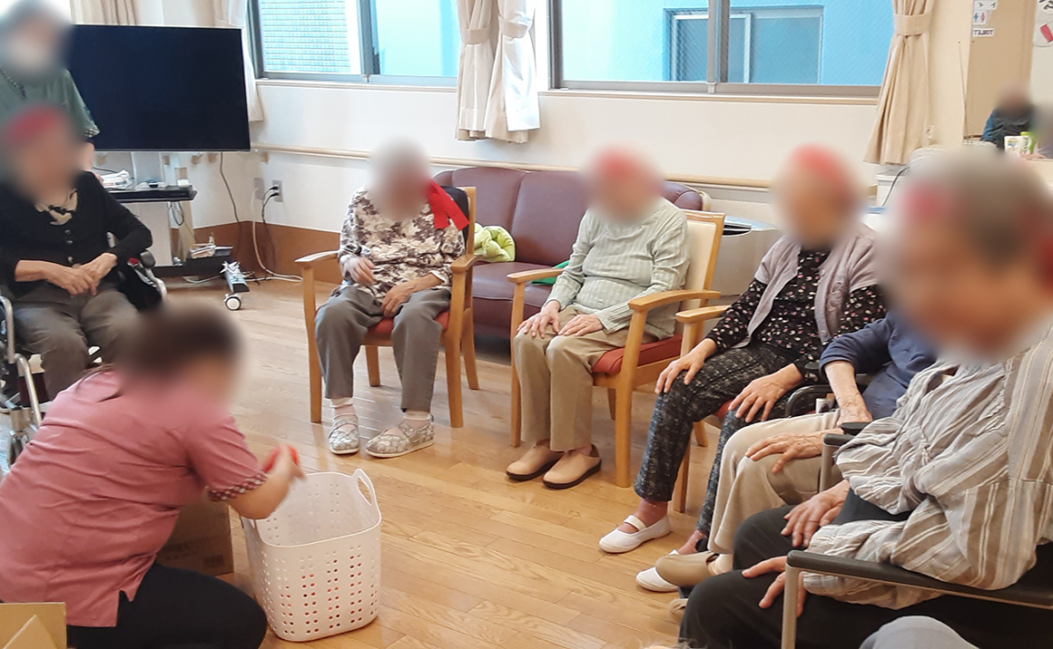 10月26日に運動会を実施しました。 利用者様が紅白に分かれて、準備体操を元気よく行いました。 最初の競技は玉入れで、箱の中に玉を多く入れたら勝ちです。 利用者様は勝ちたい気持ちで、汗だくになって参加されました。