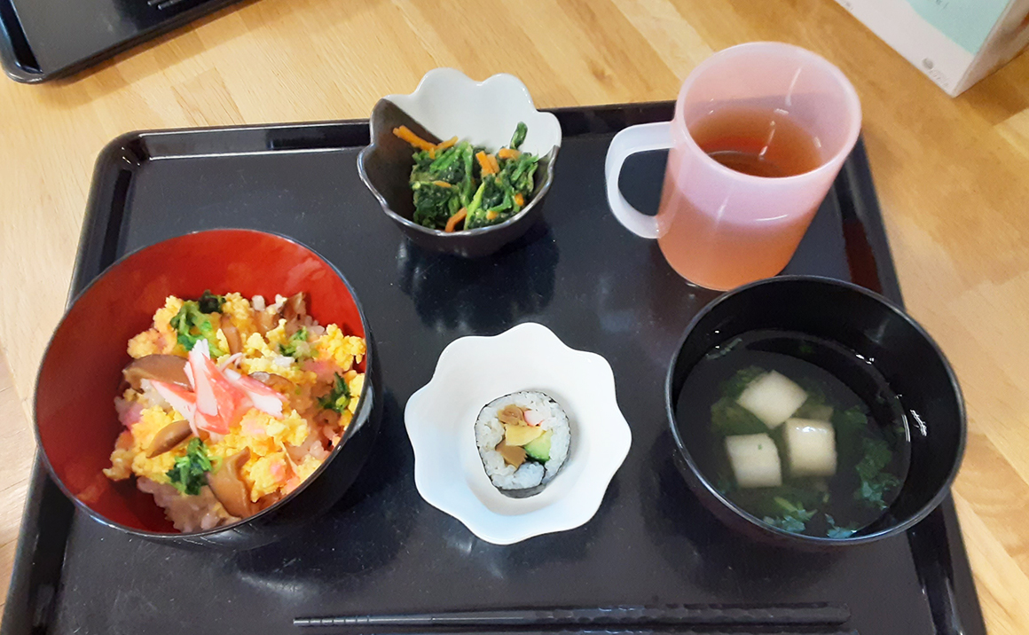 昼食は行事に合わせた、手作りのちらし寿司と海苔巻きとすまし汁。