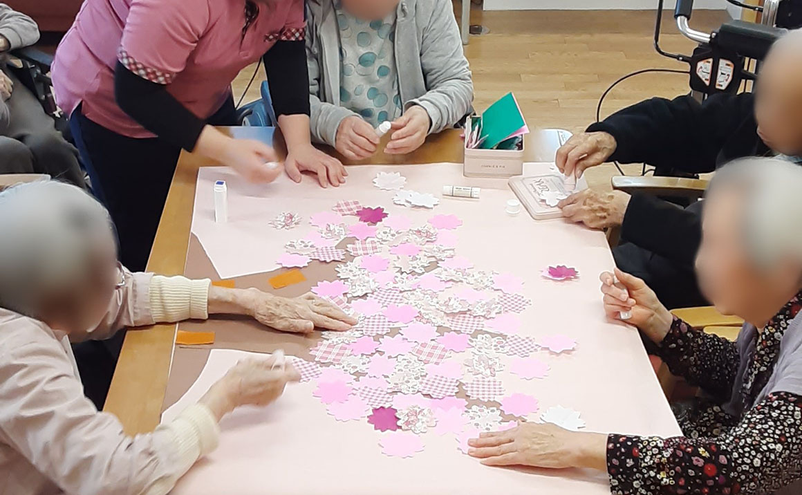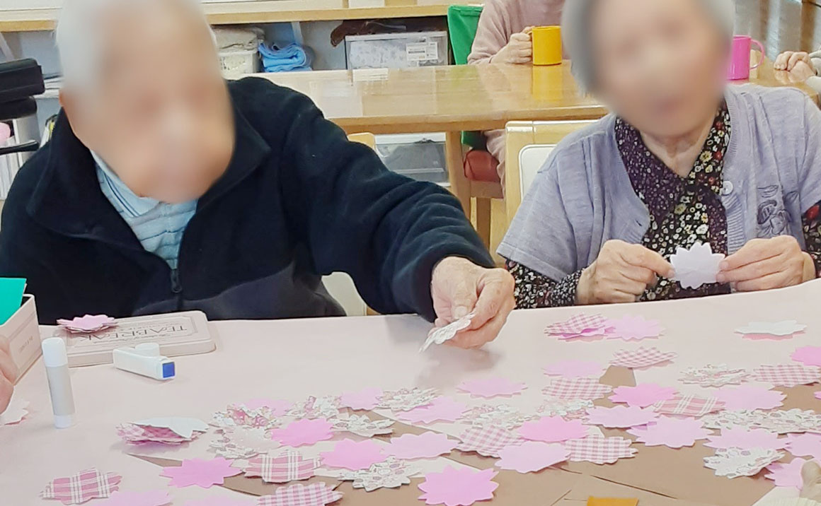 たのしい家 西ノ京では本日、紙を使って桜の木を作るレクリエーションを行いました。