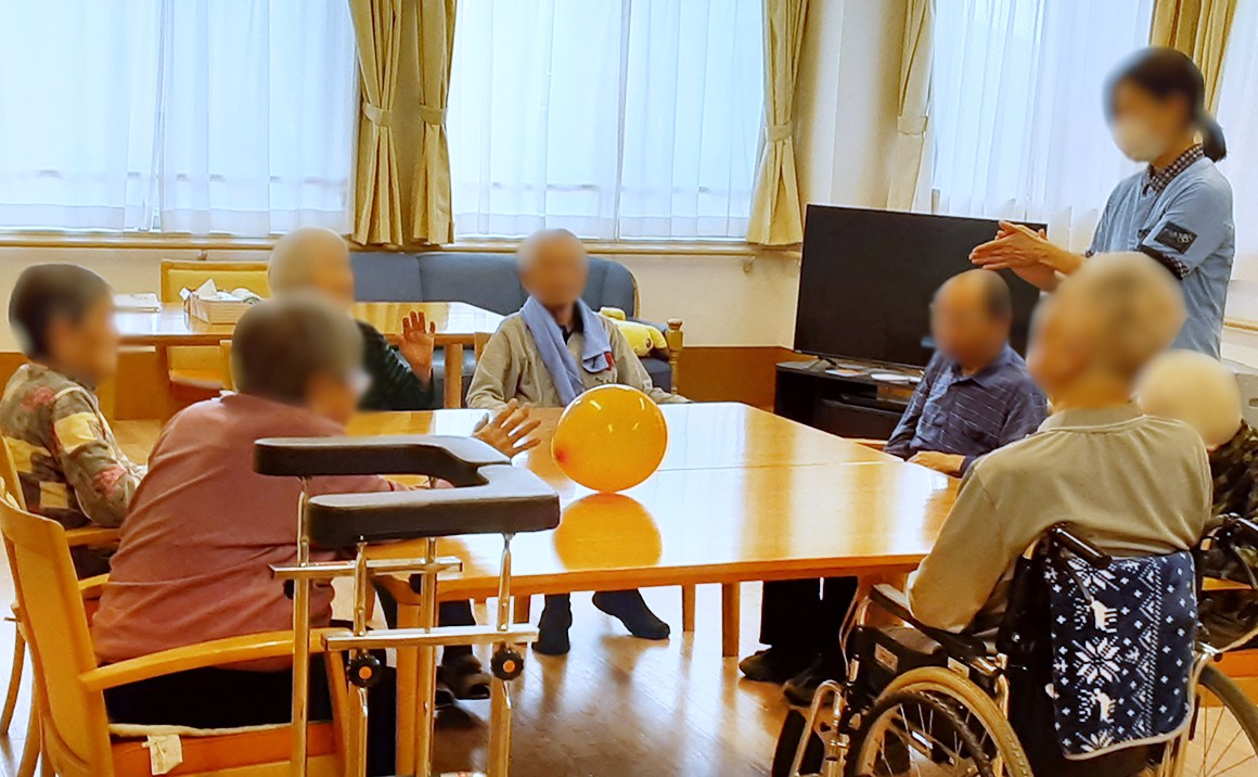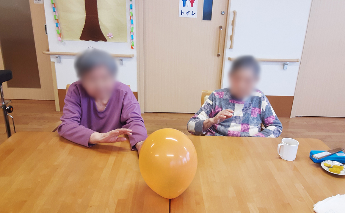今回は暖かくなってきたので久しぶりに風船バレーをしました。 あっちこっちへふわふわと逃げる風船を追いかけて、皆さま頑張っておられました。 上手く捕まえた方は笑顔が溢れ、とても楽しまれていました。
