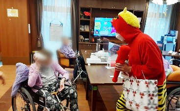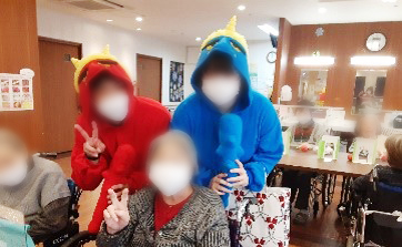 職員が赤鬼、青鬼に扮して施設内を歩き回り、ご利用者様に豆の代わりに丸めた紙を鬼に向けて投げてもらいました。