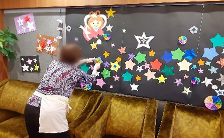 壁画はご利用者様に星をたくさん作っていただき、1階ロビーに貼ってある黒い模造紙に作って頂いた星を貼って頂き「天の川」になりました!