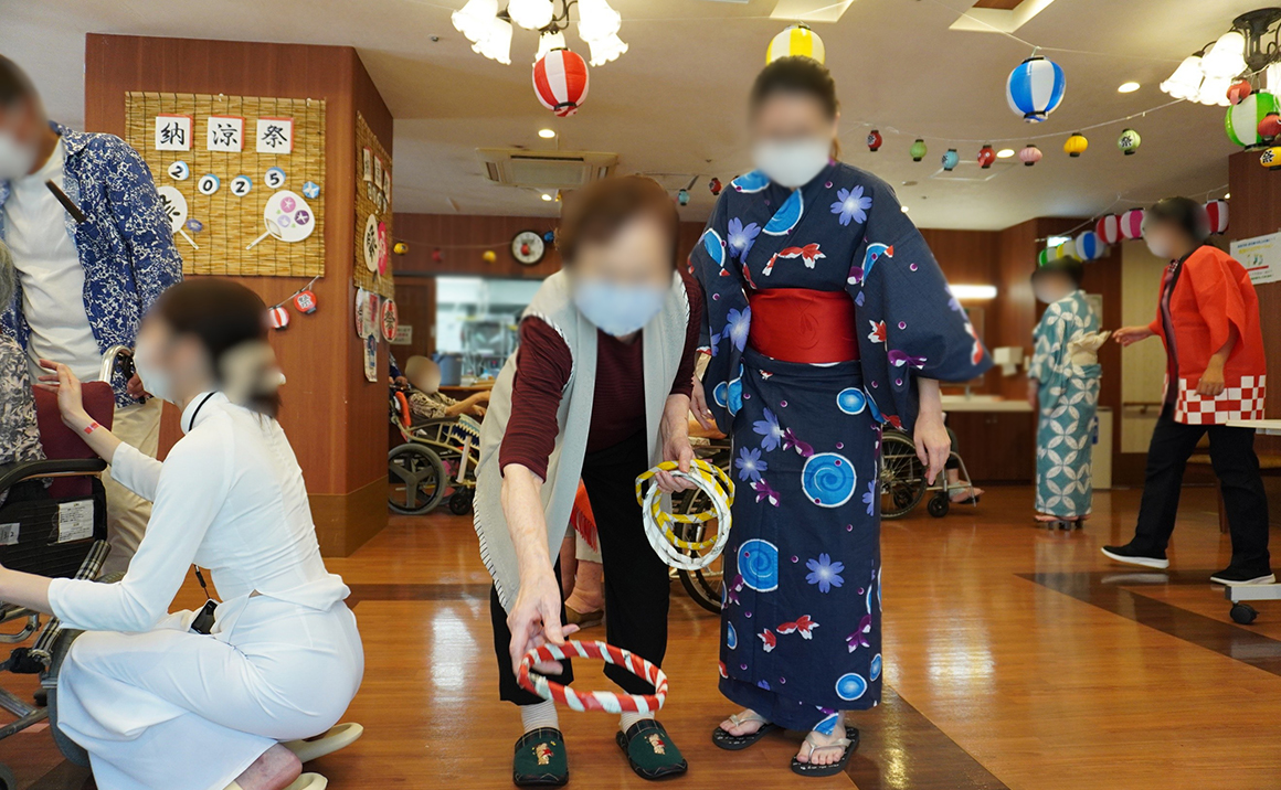 恒例行事、納涼祭。 今年も盛大に飾りつけをし、職員は浴衣を着て雰囲気作り。 盆踊り『炭坑節』『東京音頭』を職員と入居者様で一か月間練習をし、本日無事に披露することができました。 ゲームの時間には輪投げと射的で大盛り上がり。 職員も入居者様に負けじと本気モードでした。 とても楽しい1日を過ごすことができ、夜はぐっすり眠ることができたようです。