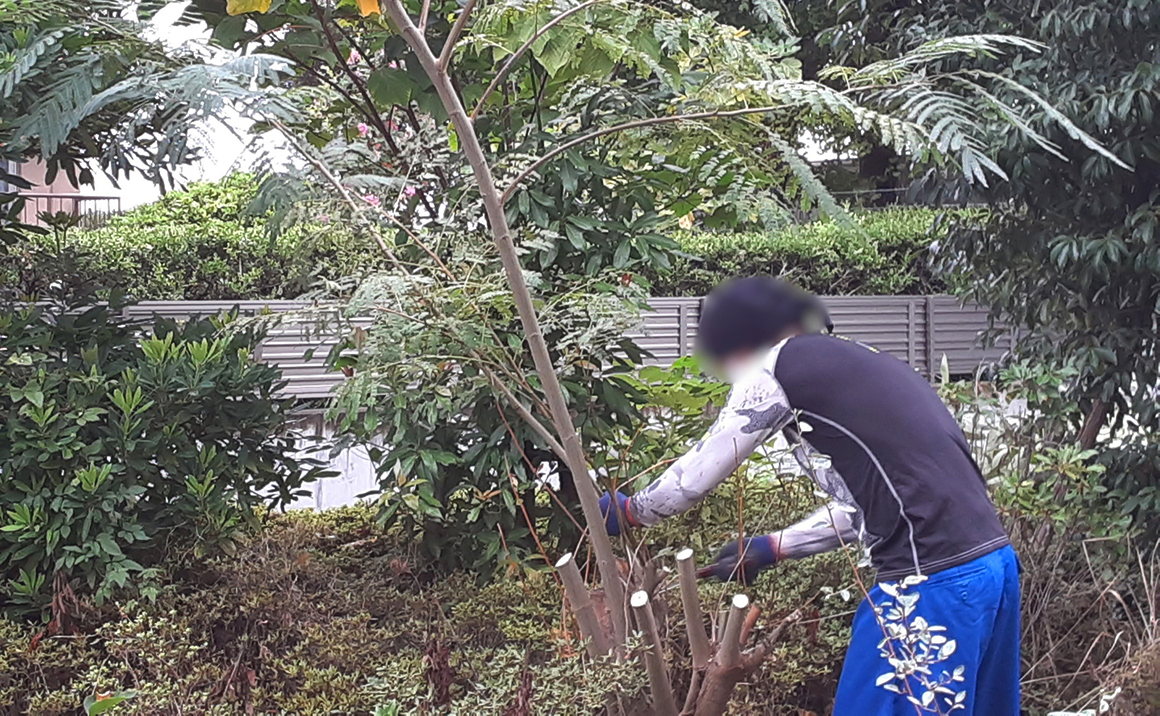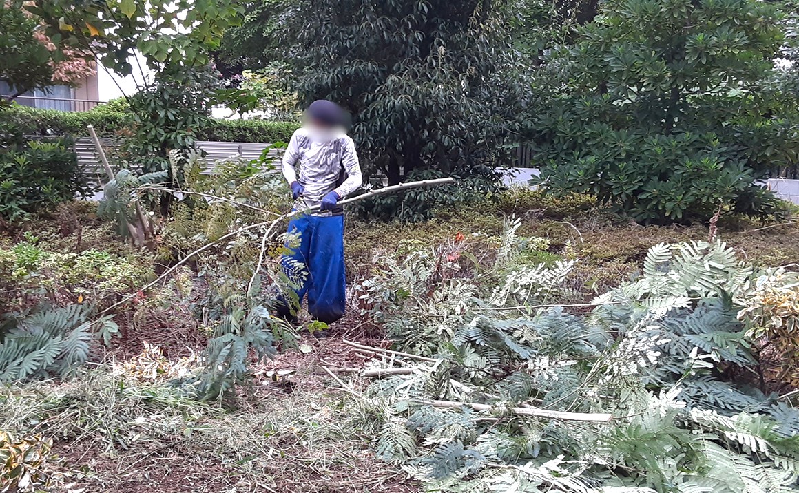 プレザングラン江東亀戸の敷地には自然豊かなお庭があります。 玄関を出て駐車場の奥にある緑の森。 しばらくそのままにしておいた為に伸び放題の草木。 その状態を見かねた親方がセッセと草刈りをしてくださいました。