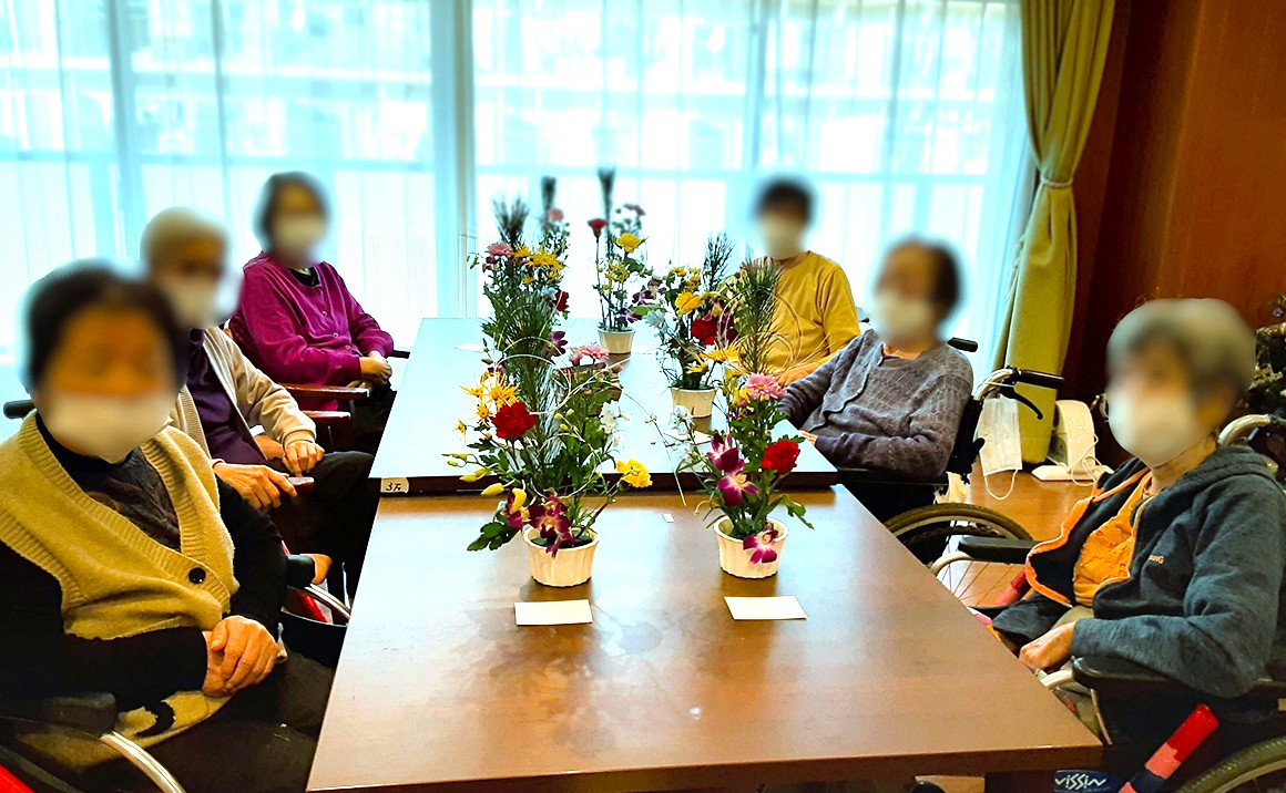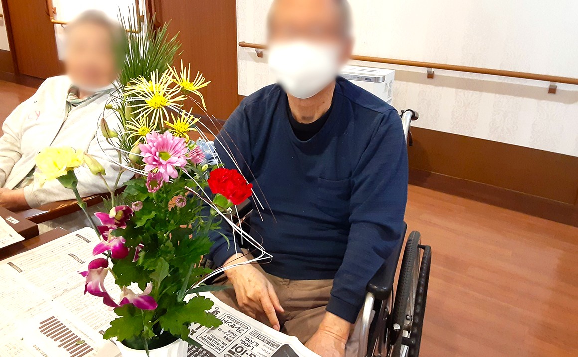 今月のフラワーアレンジメントの様子です。 新年に向けて、おめでたいアレンジになりました。 「カーネーション(赤・黄)、スプレーマム(ピンク・黄)、デンファレ、松、スプレーデルフィニューム」というお花に、金と白の水引きをアレンジしました。 とても華やかに出来上がり、ご入居者様もにこやかになっておりました。
