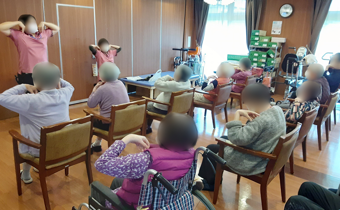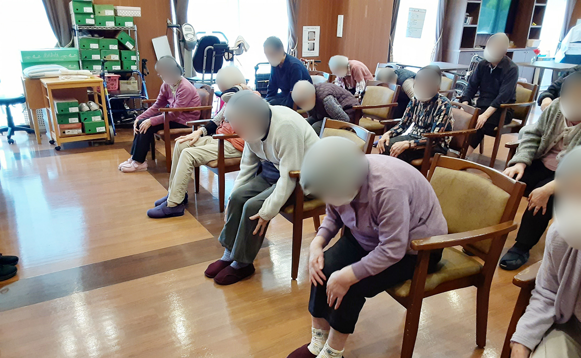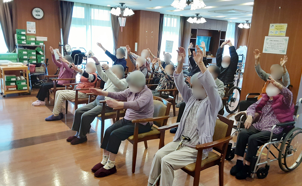 プレザングラン江東亀戸では、週に2回集団体操を行っております。 『歩く』をテーマにしている施設なので、体操も真剣に取り組んでおります。 椅子に座ったままの体操にはなりますが、全身を使うので結構な運動量となってます。 スタッフも疲れる程の体操を、すがすがしい顔でやってのけてしまう体力はすごいですね。 見習わないとですね。