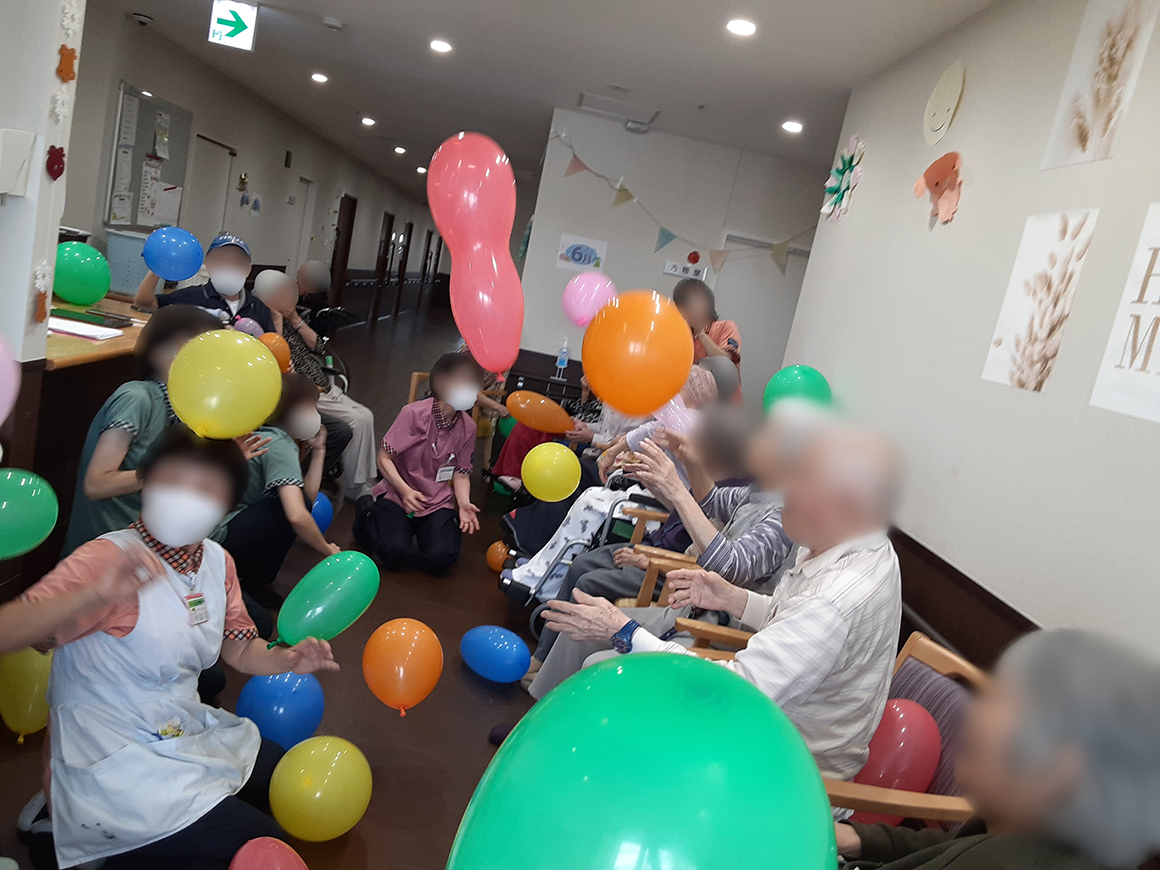 スタッフも負けじと落ちている風船を拾い上げご利用者様へ渡したり、バレーボールのように風船を打ったり…