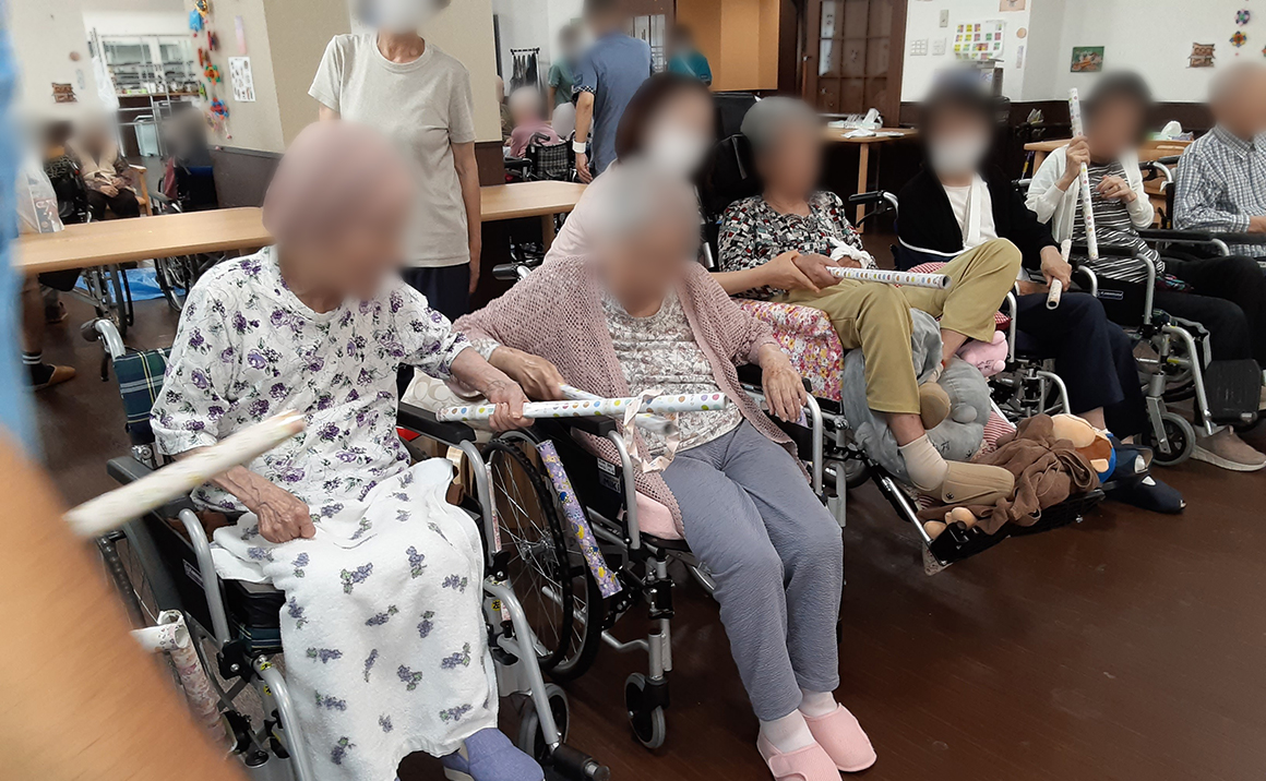 施設では夏の海を感じるイベントをスタッフが考え各階の皆さん全員で食堂にてイベントを行いました。