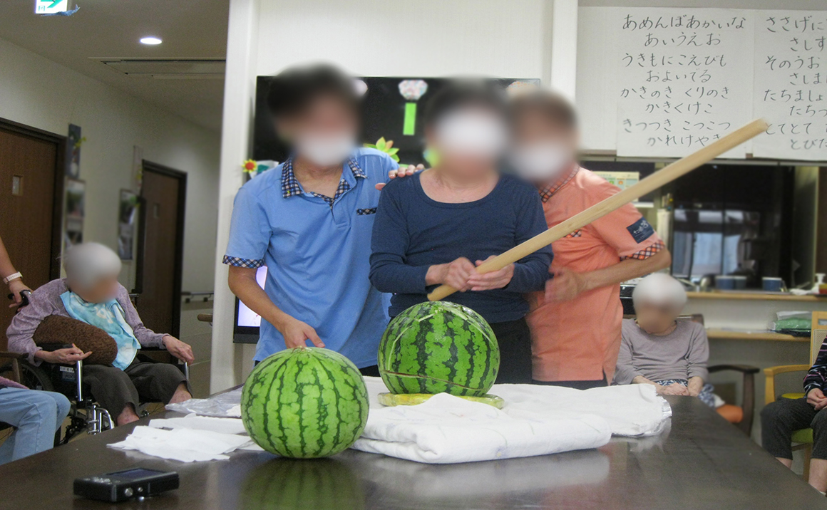 8月はスイカ割りイベントでした。 実習で来られてた学生さん達にも参加して頂きました。 スイカに当たらなかったものの、力強く振りぬかれた方、当たったものの割れなかったり、途中本物のスイカではなく、風船のスイカに変えたり、、、。 たくさん笑いありの楽しいスイカ割りの時間になりました!