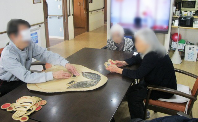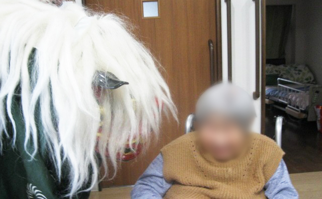 お正月恒例の獅子舞、福笑い、トランプを楽しみました。