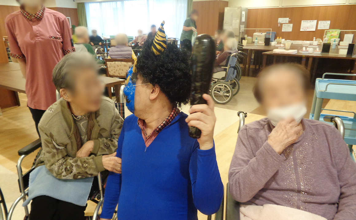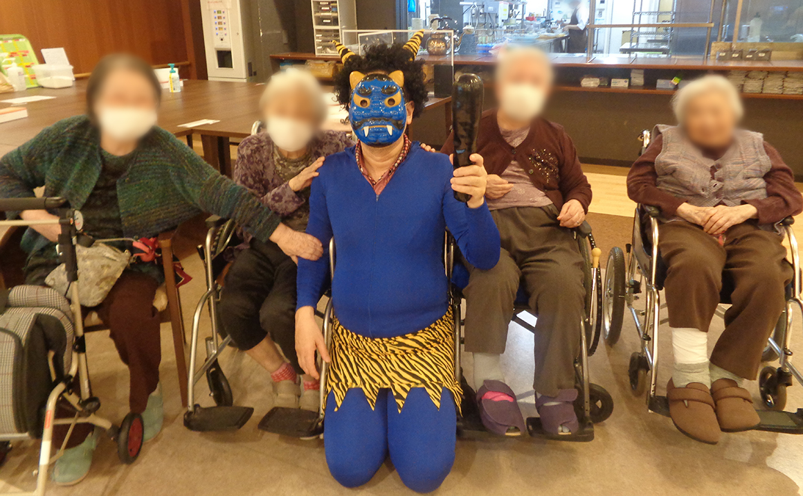一日早く、『豆まき』イベントを開催しました。 鬼さんの立派なお腹をめがけて甘納豆のパックを投げるのですが、 思いっきり投げる方は数名だけで… 写真のように、鬼さんと仲良くしたいご入居者ばかりでした(笑)