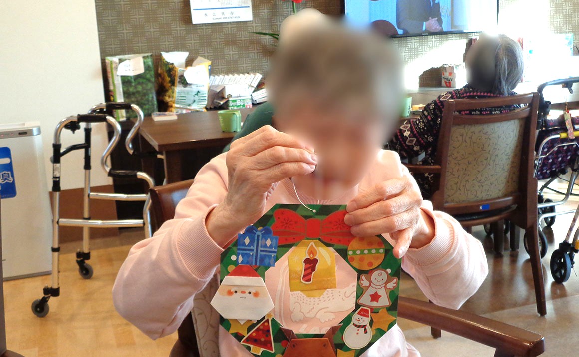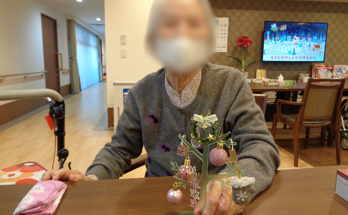 ペーパークラフトのクリスマスリース制作、ミニサイズのツリーをデコレーションして いただきました。 『昔は子供のためにツリーを飾っていたけれど、自分用ツリーは初めてかも♡』と仰りながら 居室に飾っておられました。