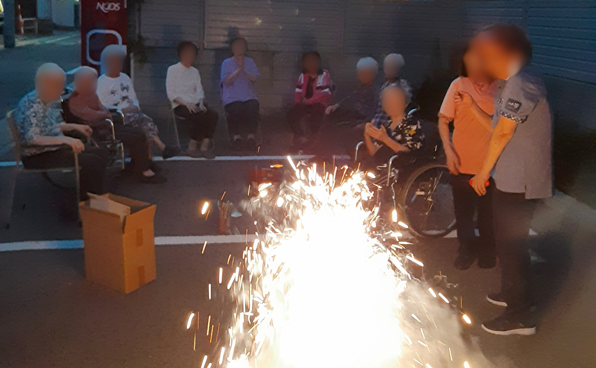 まだまだ暑い日が続いてますが、たのしい家垂水の入居者様は今日もお元気に過ごされています。 本来は先月開催予定ではありましたプチ花火大会を開催いたしました。 職員及び入居者様と一緒に楽しい時間を過ごしました。
