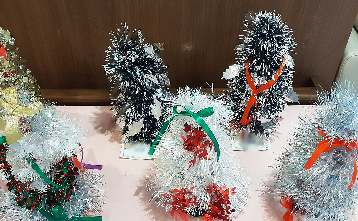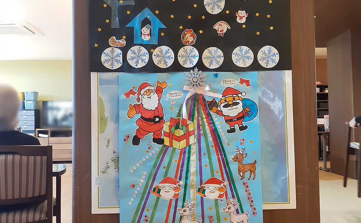 皆様、こんにちは プレザンメゾン朝霞では12月19日(木)にクリスマス会を開催予定です。 今回は、ご入居者様がクリスマス用でウォールアートや工作をしてくださいました。 どれも完成度の高い素晴らしい作品です。 皆さんでクリスマスを楽しみに待っています。 ご見学の際には、じっくり楽しんでください。