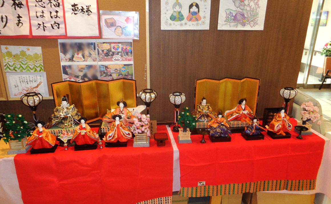 当施設の日常のご様子を紹介します! 入居者様と一緒に3週間後の3月3日に行う、ひな祭りの準備を行いました。 一緒に職員と入居者様とで「もう、早いわね~3月になるのよね~雛人形の順番ってどれだっけ?」と 「幼少期に戻ったみたいだわ!」と入居者様同士で笑いながら楽しく準備をされておりました。
