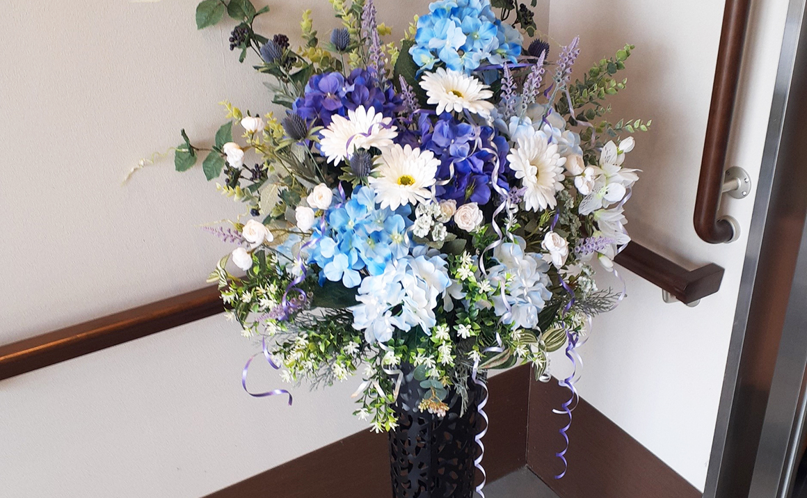 施設の玄関にお花を飾りました。 ご来訪いただく皆さまが、少しでも明るい気持ちになっていただけたらという想いを込めています。 季節ごとに変わる彩りを、ぜひお楽しみください。