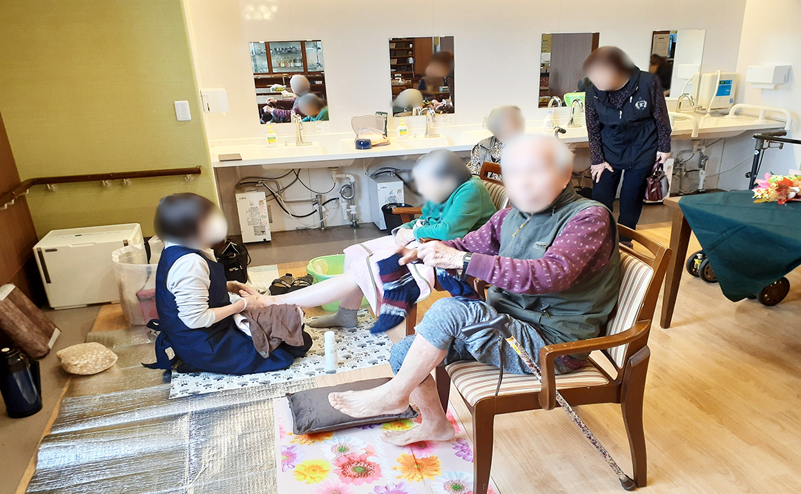 今日は訪問美容の一コマを御紹介します。 降雪があり寒い日でしたが、ぽかぽか足浴で、まずはリラックス。 参加された入居者のみなさまは、「あぁ、気持ちいい」と笑顔を見せてくださいました。 温まった足先と一緒に、気持ちもゆるんでいきます。 今日も穏やかな時間を共有できました。