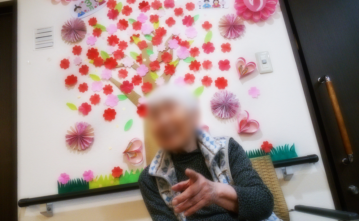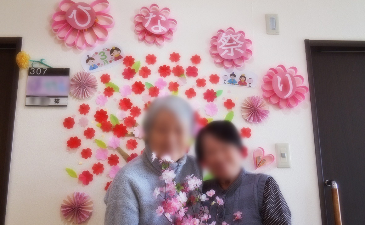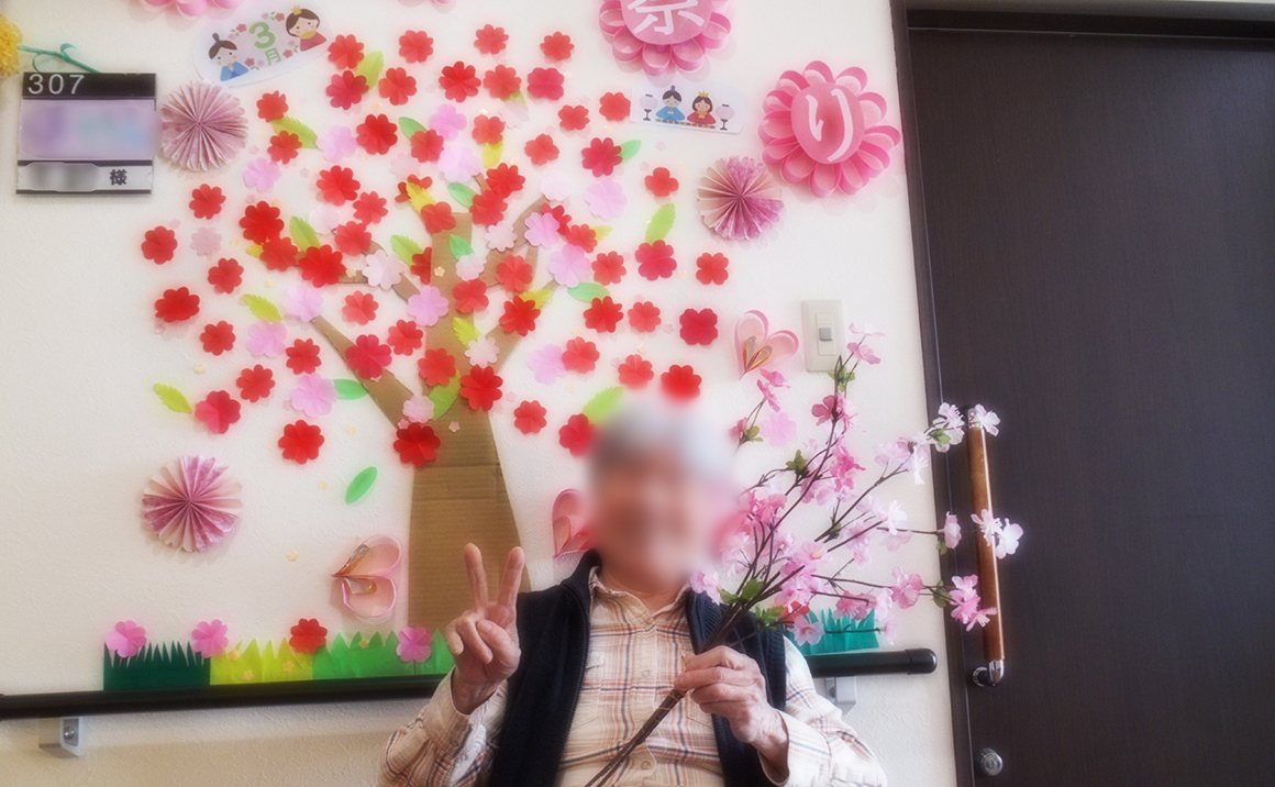利用者様と職員とで素敵なひな祭りの壁飾りを作成しましたので、その前で記念撮影。素敵な笑顔が撮れました。